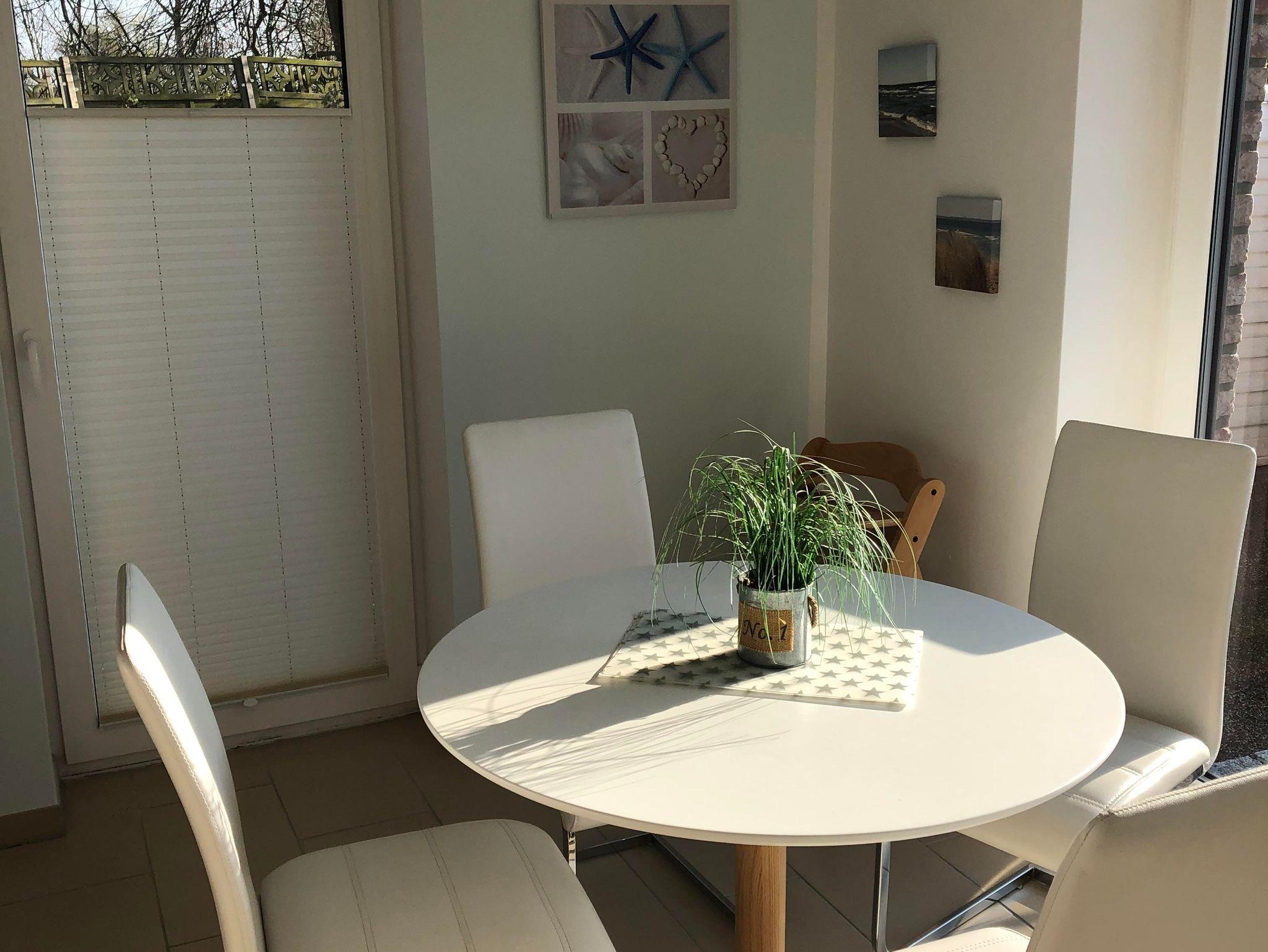 Die Wohnung verfügt über eine offene Küche mit Geschirrspüler, Cerankochfeld mit 4 Feldern, Backofen, Kühlschrank mit Gefrierfach, Toaster, Kaffeemaschine, Caffisimo Maschine,Wasserkocher, Mikrowelle und genügend Geschirr sowie Gläser. Es grenzt der Eßbereich mit Eßtisch und vier Stühlen an die Küche.