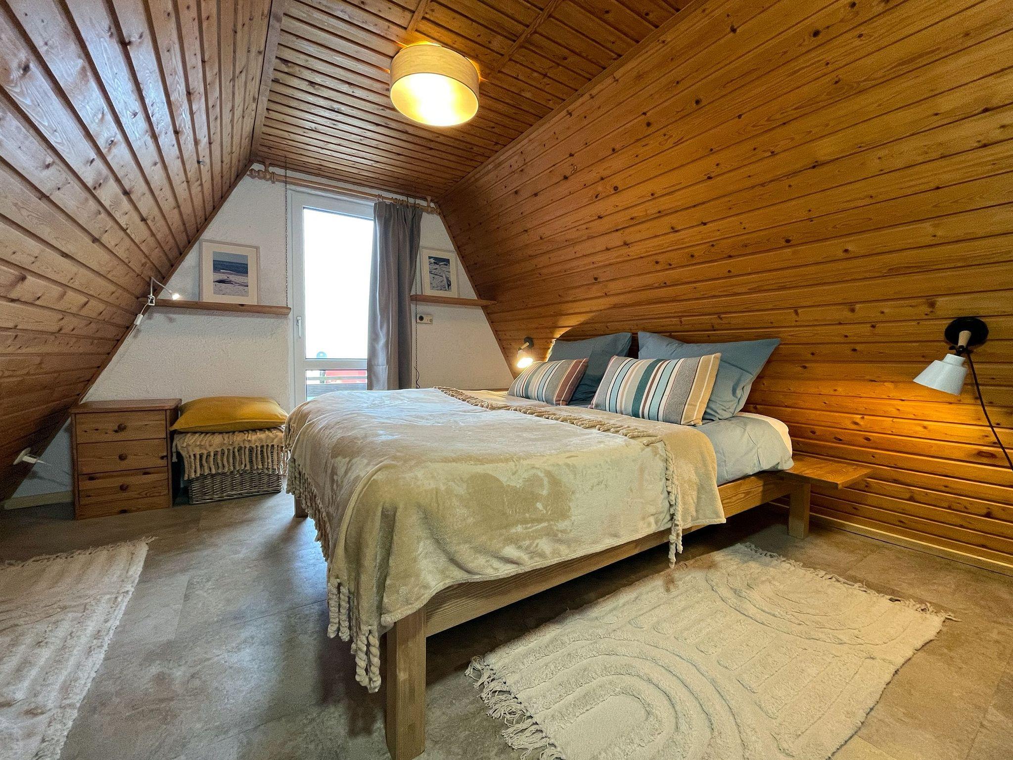 • 2 kleine Schlafzimmer mit Heizkörper unter Dachschrägen: 1 kleines Kinderzimmer (2 Einzelliegen), 1 Schlafzimmer (Doppelbett 1,60m x 2m + Zusatzbett 0,80m x 1,80m), Babybett stellbar. Balkon mit Meerblick.
