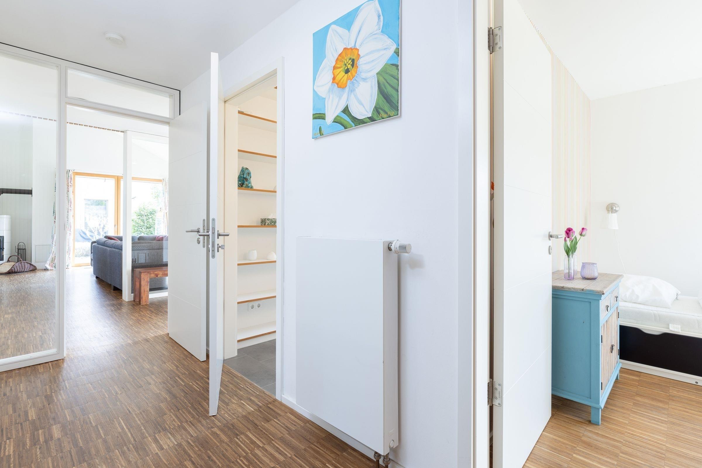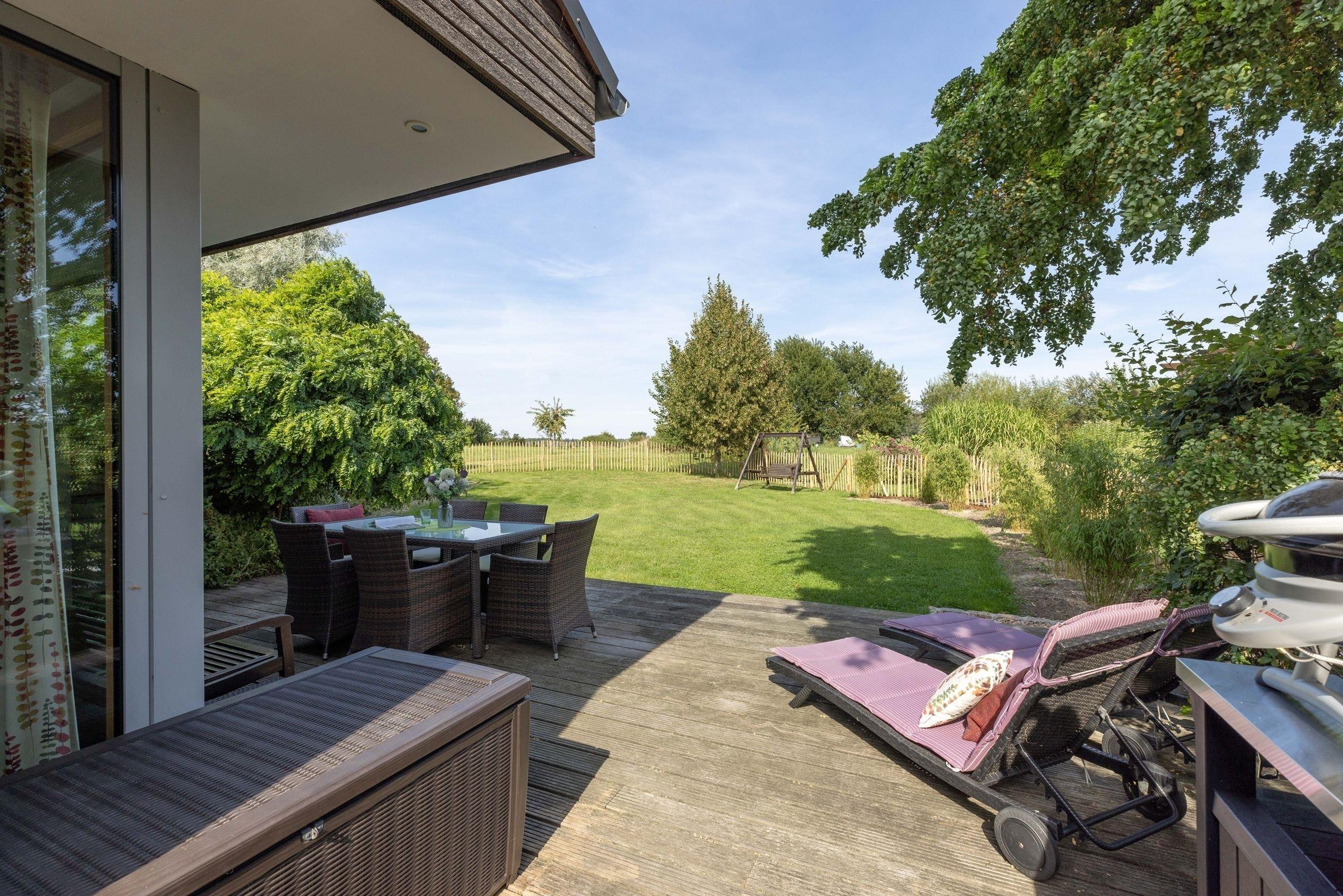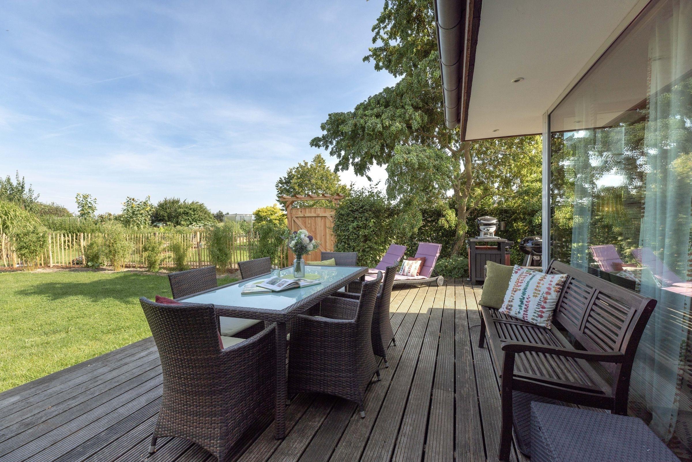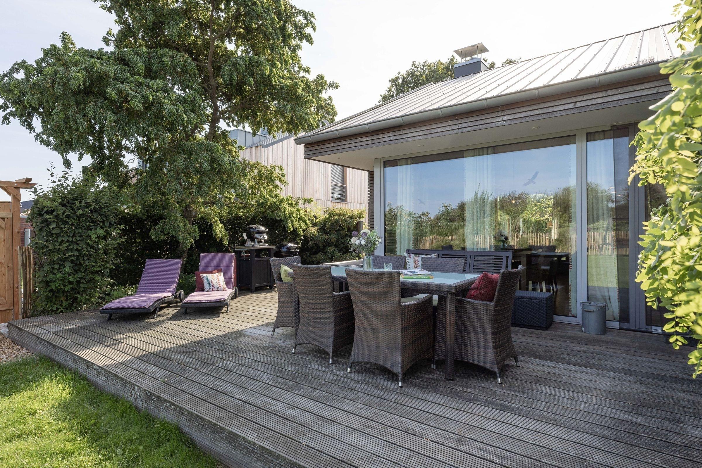 Ihr Domizil beeindruckt durch eine große Kuschelecke mit Kamin und Flat-TV, einer angrenzenden Küche und einem Essplatz für alle Gäste. Das lichtdurchflutete Wohnzimmer mit hohen Decken ist stilvoll eingerichtet und sorgt sofort für ein Wohlgefühl. Von hier haben Sie Zugang auf die 35 m² große Terrasse mit Nord-Ost-Ausrichtung, die dank Sonnenliegen und Gartenmöbeln zum Relaxen einlädt. Es steht Ihnen auch ein Holzkohlegrill und ein Gasgrill für lauschige Abende zur Verfügung. In der offenen, voll ausgestatteten Küche bereiten Sie leckere Köstlichkeiten zu. Sie haben die Möglichkeit sich in eines der 3 Schlafzimmer zum Träumen zurückzuziehen. Zwei der Schlafzimmer sind mit komfortablen Doppelbetten (2x 90x200 cm), Kleiderschrank, TV und Plissees ausgestattet. Eines der 3 Schlafzimmer verfügt über ein Einzelbett (90x200 cm), Kleiderschrank und ebenfalls Plissees. Genießen Sie den Komfort einer bodengleichen Dusche oder lassen Sie sich eine Badewanne ein, nach langen Spaziergängen am Strand. Eine Sauna macht dieses Ferienhaus auch in der kalten Jahreszeit zu einem tollen Reiseziel.