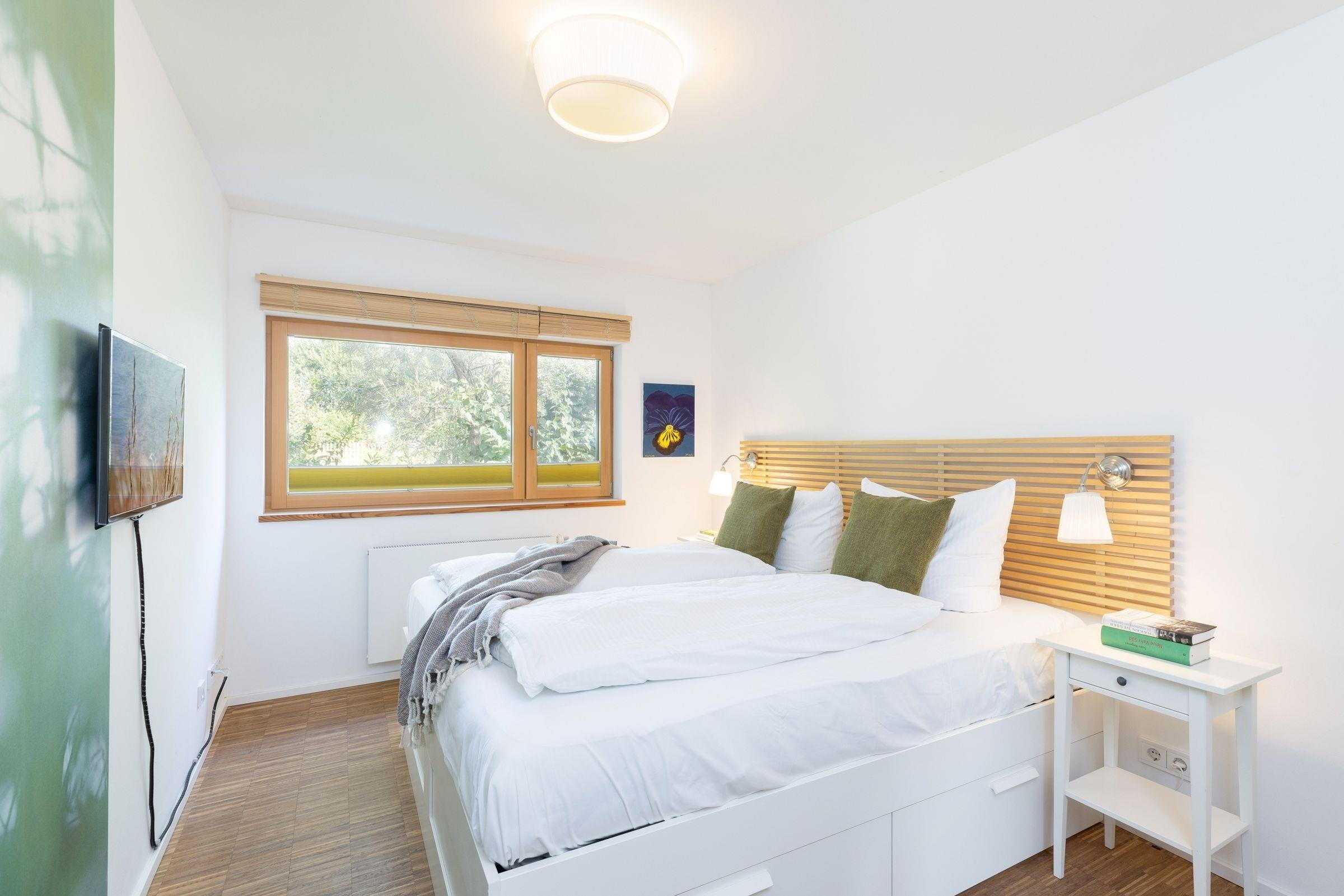 2. Schlafzimmer: 1 Doppelbett (2x 90x200 cm), Kleiderschrank, TV, Verdunkelung/Sichtschutz: Plissee, Platz für Babybett vorhanden