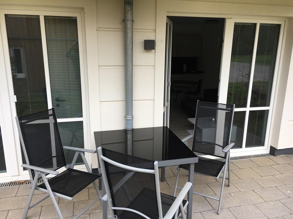 40 m² 2-Raum-Wohnung, Ausgang zur Sonnenterrasse von Wohnzimmer und Schlafraum.