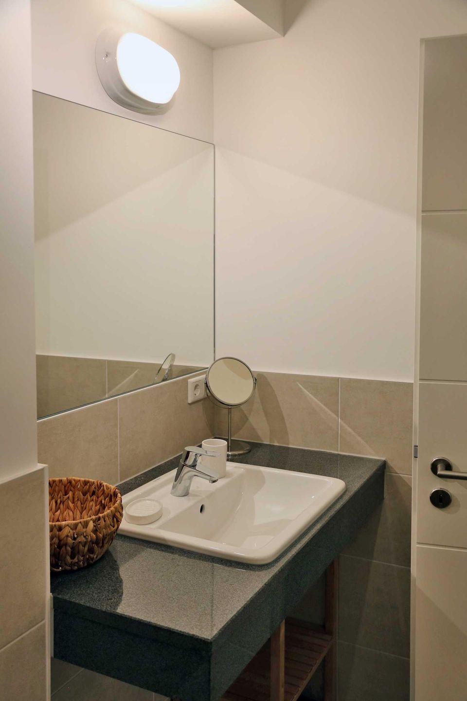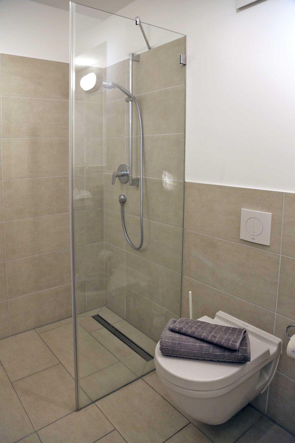 Unser Badezimmer verfügt über eine ebenerdige Dusche, WC, Handtuchheizkörper und