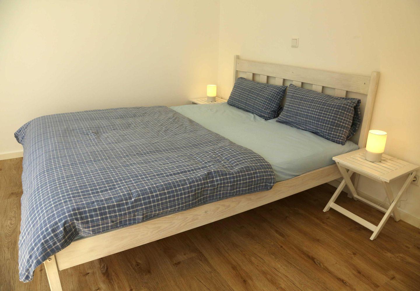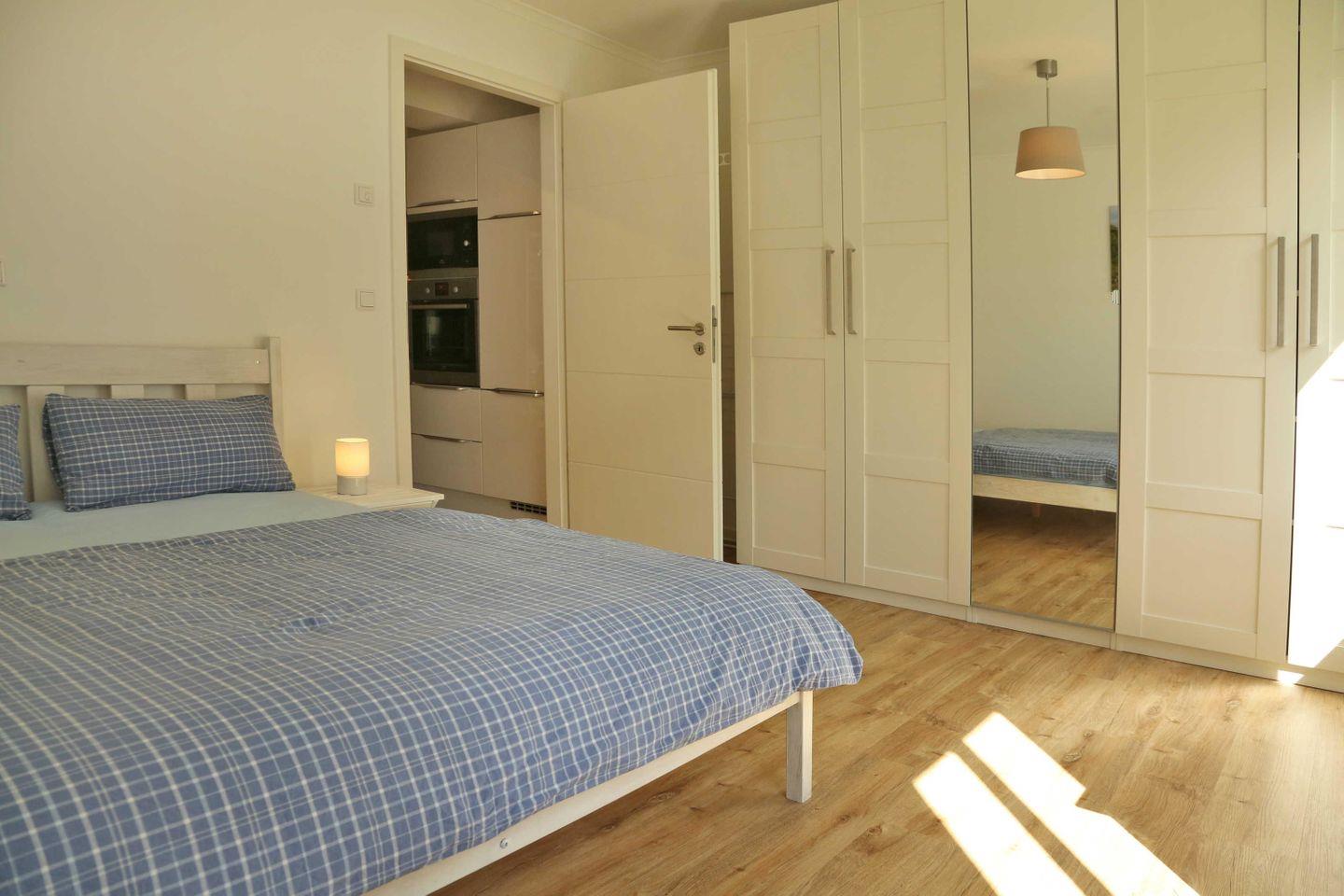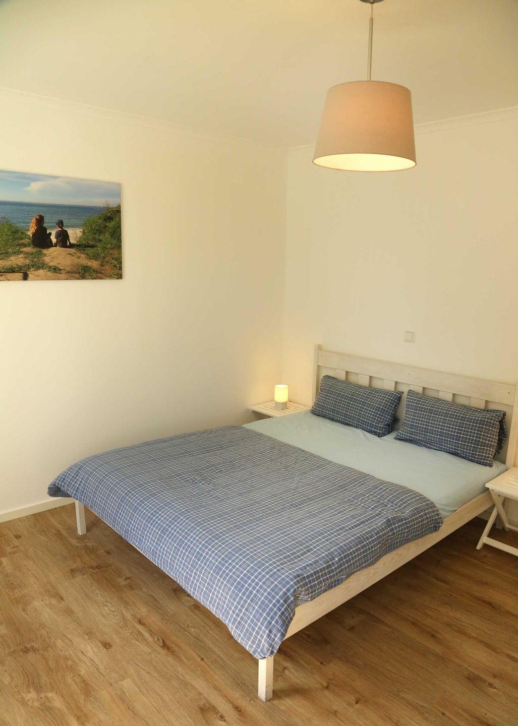 Das Schlafzimmer ist mit einem Doppelbett in der Größe 160cm x 200cm
