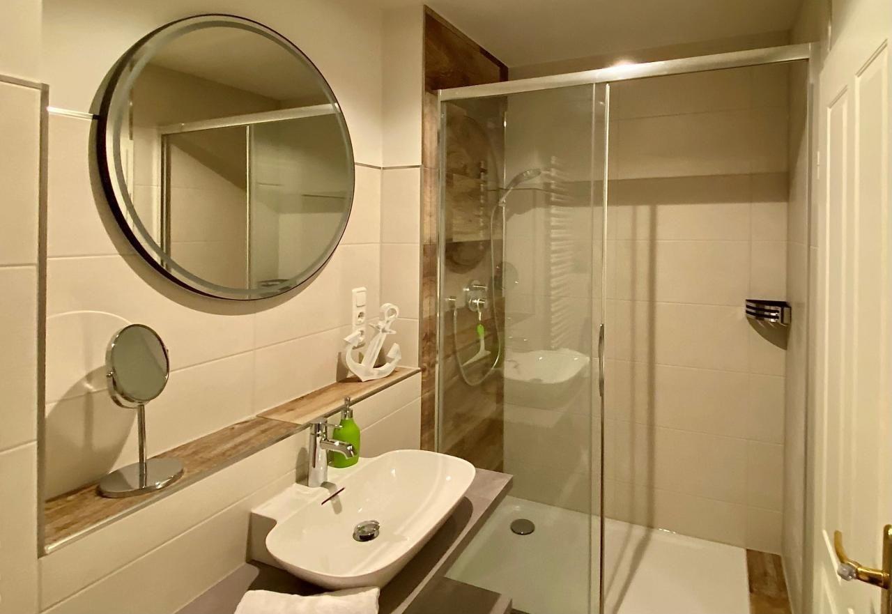 Das moderne Badezimmer bietet alles, was Sie für einen entspannten Start in den Tag brauchen: Dusche, WC, Waschbecken mit großzügigem Unterschrank, Handtuchtrockner und ausreichend Ablageflächen für Ihre Pflegeprodukte.