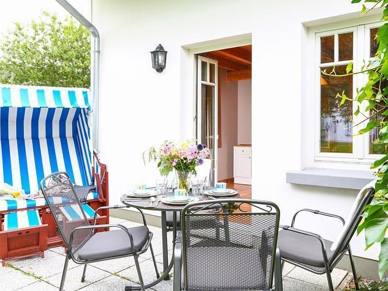 Genießen Sie das Ostsee-Feeling mit der ganzen Familie auf der romantisch anmutenden Terrasse, die Ihnen einen fantastischen freien Blick auf die Ruhe ausstrahlende Umgebung mit weitläufigen Rasenflächen, die das Ferienhaus umfassen, bietet. Moderne Gartenmöbel und ein hübscher Strandkorb laden zum gemütlichen Verweilen ein und vervollständigen das harmonische Ambiente im Außenbereich des Hauses.