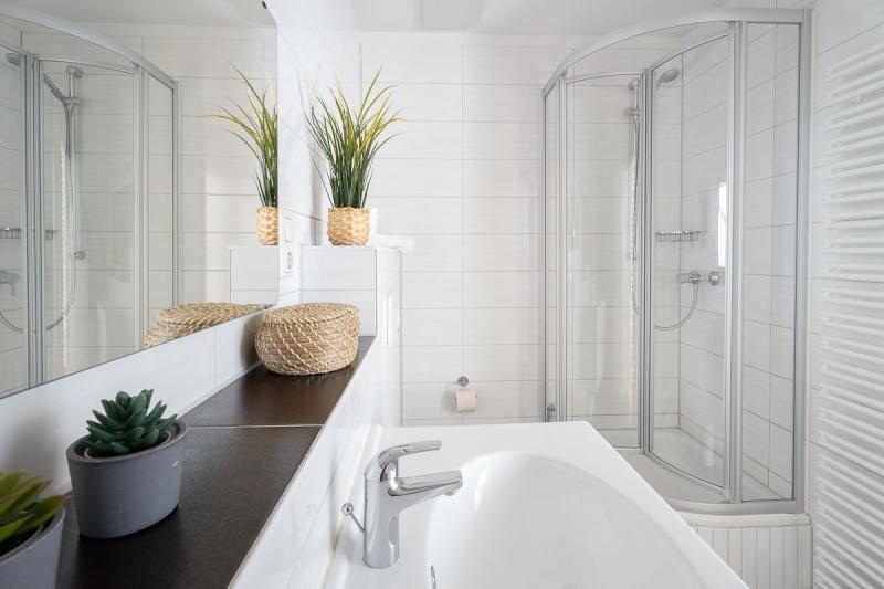 Das moderne Badezimmer im Obergeschoss bietet eine Dusche, ein WC, ein Waschbecken mit Unterschrank, einen Handtuchtrockner sowie praktische Ablageflächen für Ihre Badutensilien.