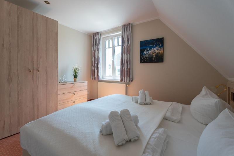Über eine Wendeltreppe gelangen Sie in das Obergeschoss mit einem gemütlichen Schlafzimmer, ausgestattet mit einem Doppelbett und einem großen Kleiderschrank für Ihre Urlaubsgarderobe.