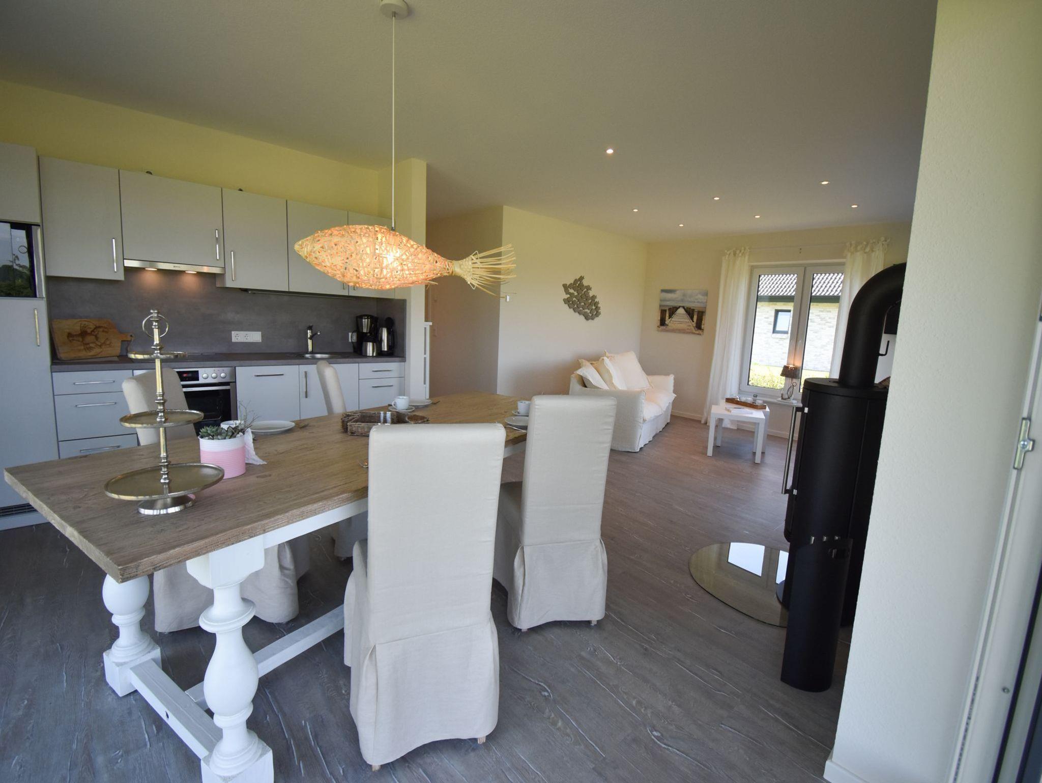 • Wohn- und Essbereich mit offener Küche, massivem Esstisch (2,50 m lang), Induktionskochfeld, Kaminofen und anliegender Terrasse