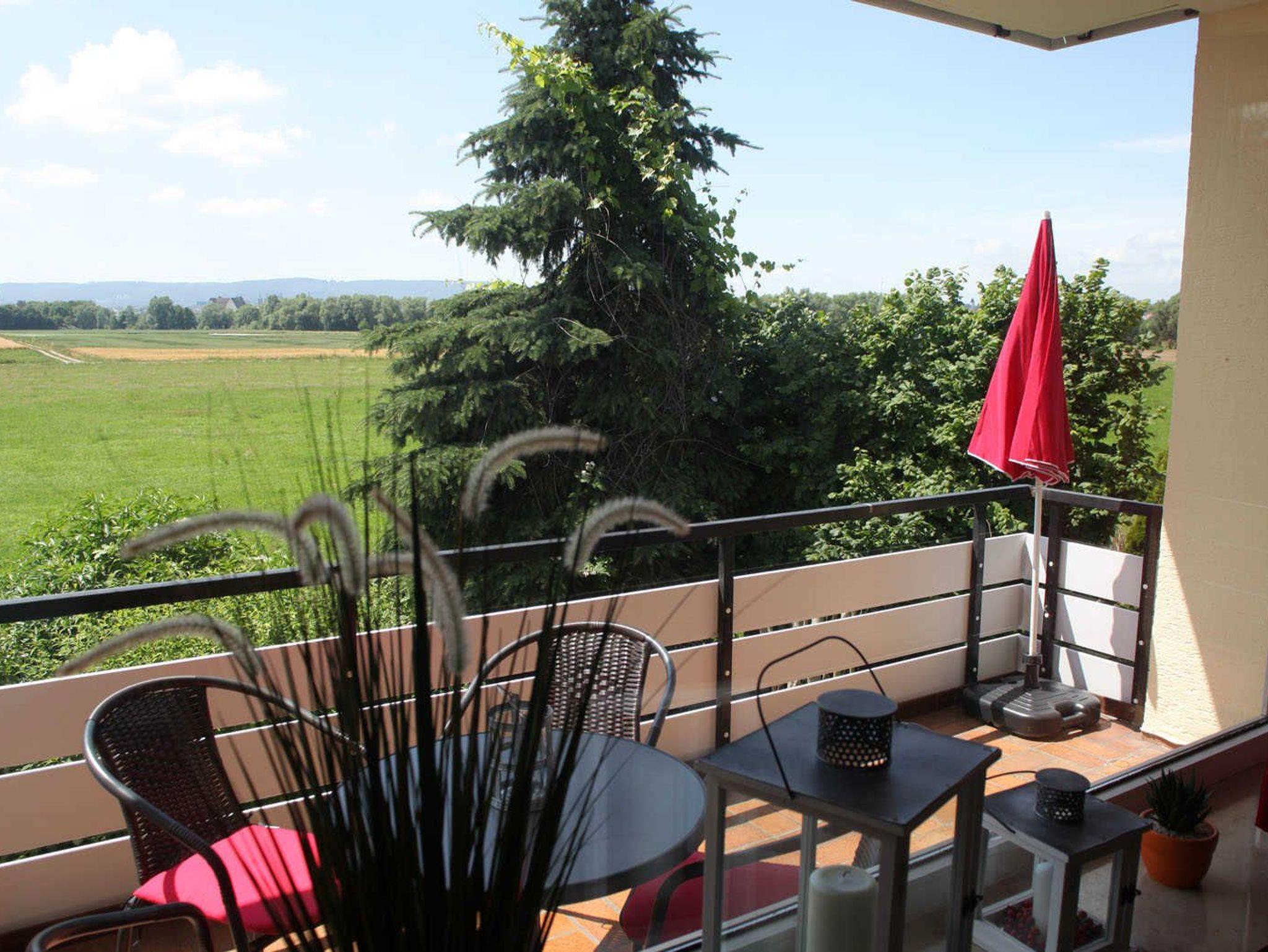 Der große Süd-Balkon besticht durch seinen Blick auf die weitläufige Fulda-Aue sowie auf den Herkules (Unesco-Weltkulturerbe). Mit Tisch und Stühlen lädt er zum Verweilen in der Sonne ein.