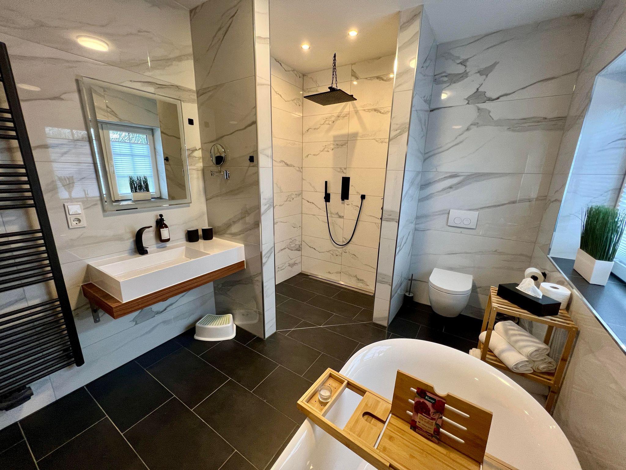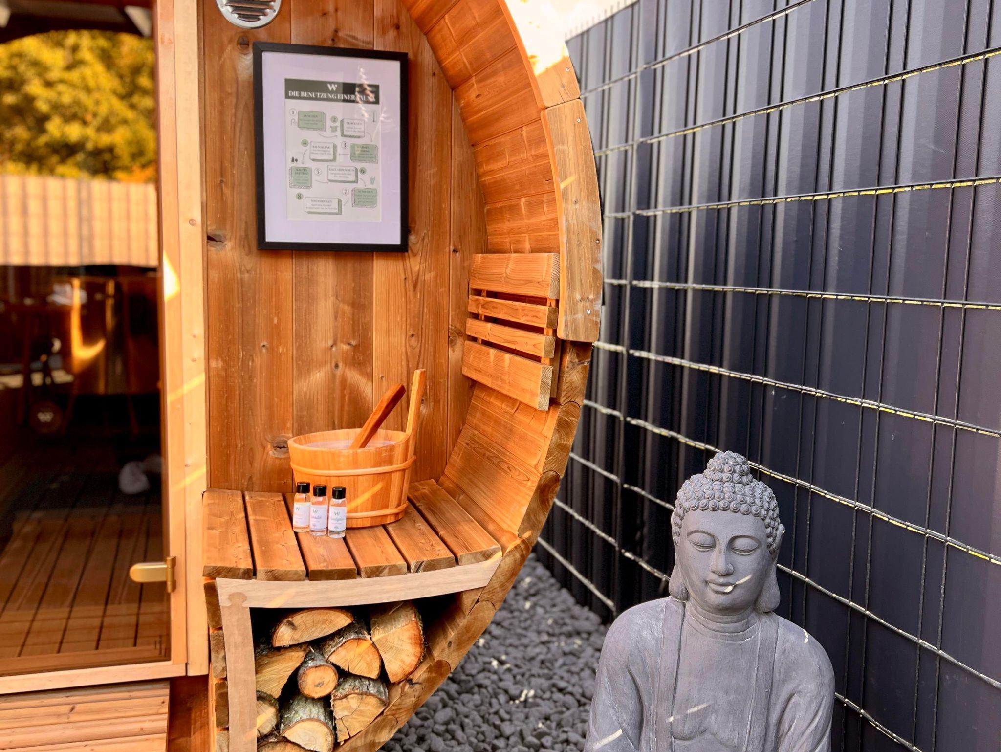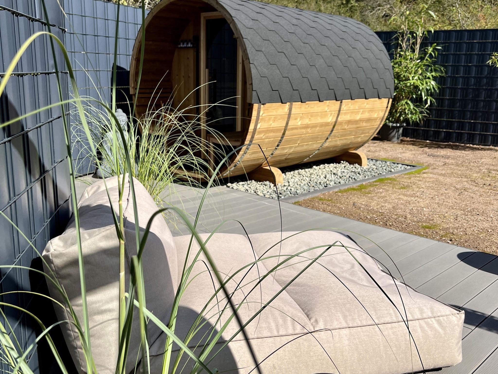 Die wunderschöne Ferienwohnung (90qm) für bis zu 3 Personen mit 1 Schlafzimmer (1 Doppelbett, 1 Einzelbett), einem großzügigen Bad mit ebenerdiger Dusche und stilvoll gestaltetem Wohn-Essbereich mit offener, voll ausgestatteter Küche bietet perfekten Wohnkomfort bei allen Gelegenheiten. Unsere Ferienwohnung der Luxusklasse verfügt neben Spülmaschine und Flachbild-TV über eine wunderschöne, ruhig gelegene Terrasse, die rundherum Sichtschutz bietet. Diesen brauchen Sie auch, wenn Sie in Ihrem persönlichen Whirlpool oder der Fasssauna im Garten einfach nur entspannen möchten!