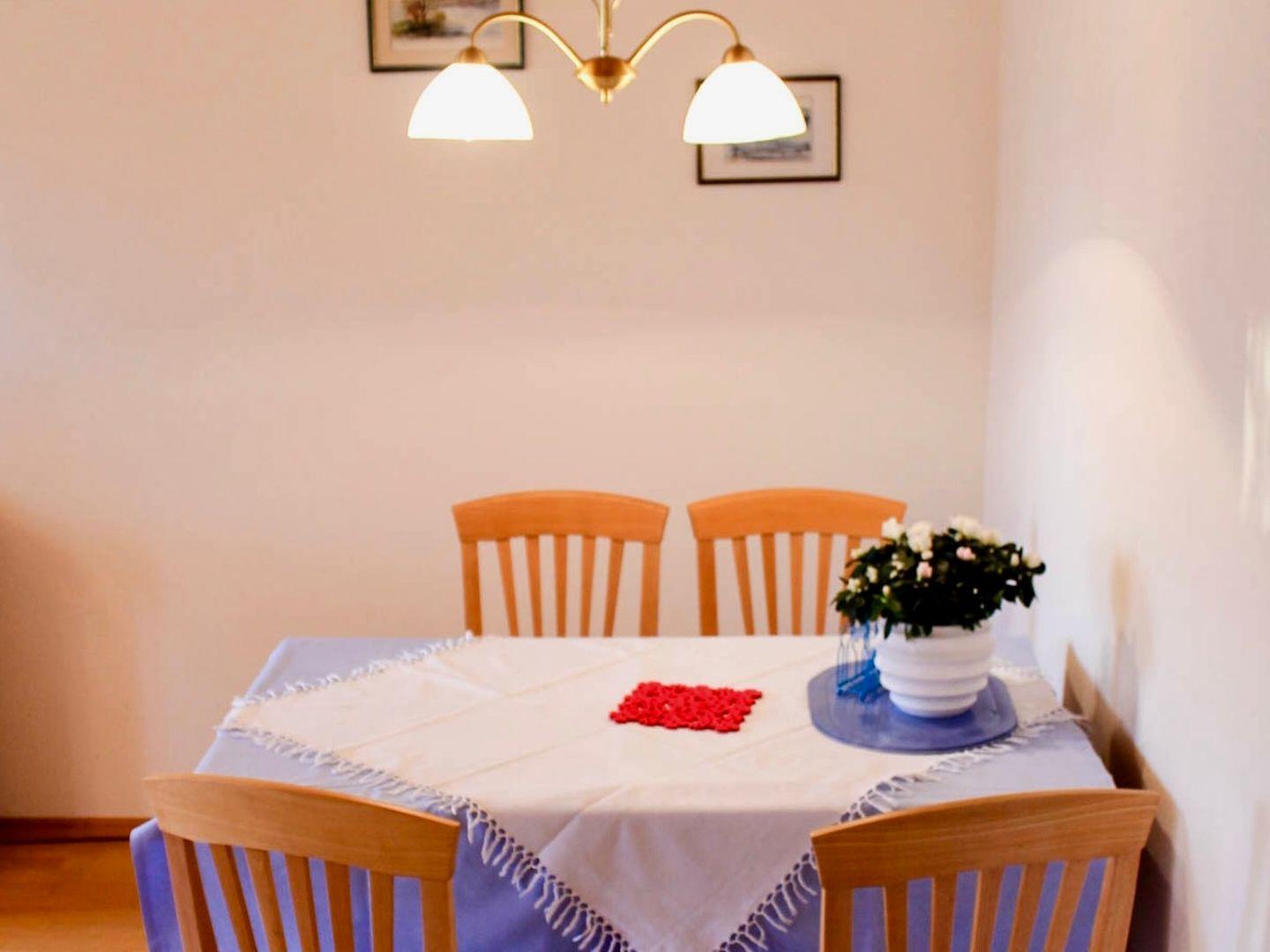 Die Ferienwohnung Kuprella 1 befindet sich im 1. Obergeschoss des Ferienhauses in Nonnenhorn und bietet auf rund 43 m² idealen Komfort für zwei Personen. Die liebevoll eingerichtete Wohnung verfügt über ein separates Schlafzimmer sowie einen gemütlichen Wohnraum, der zu entspannten Stunden einlädt. Die Küchennische mit Mikrowelle ermöglicht eine bequeme Selbstversorgung, während das komplett ausgestattete Badezimmer mit Dusche, WC und Fön für zusätzlichen Komfort sorgt.