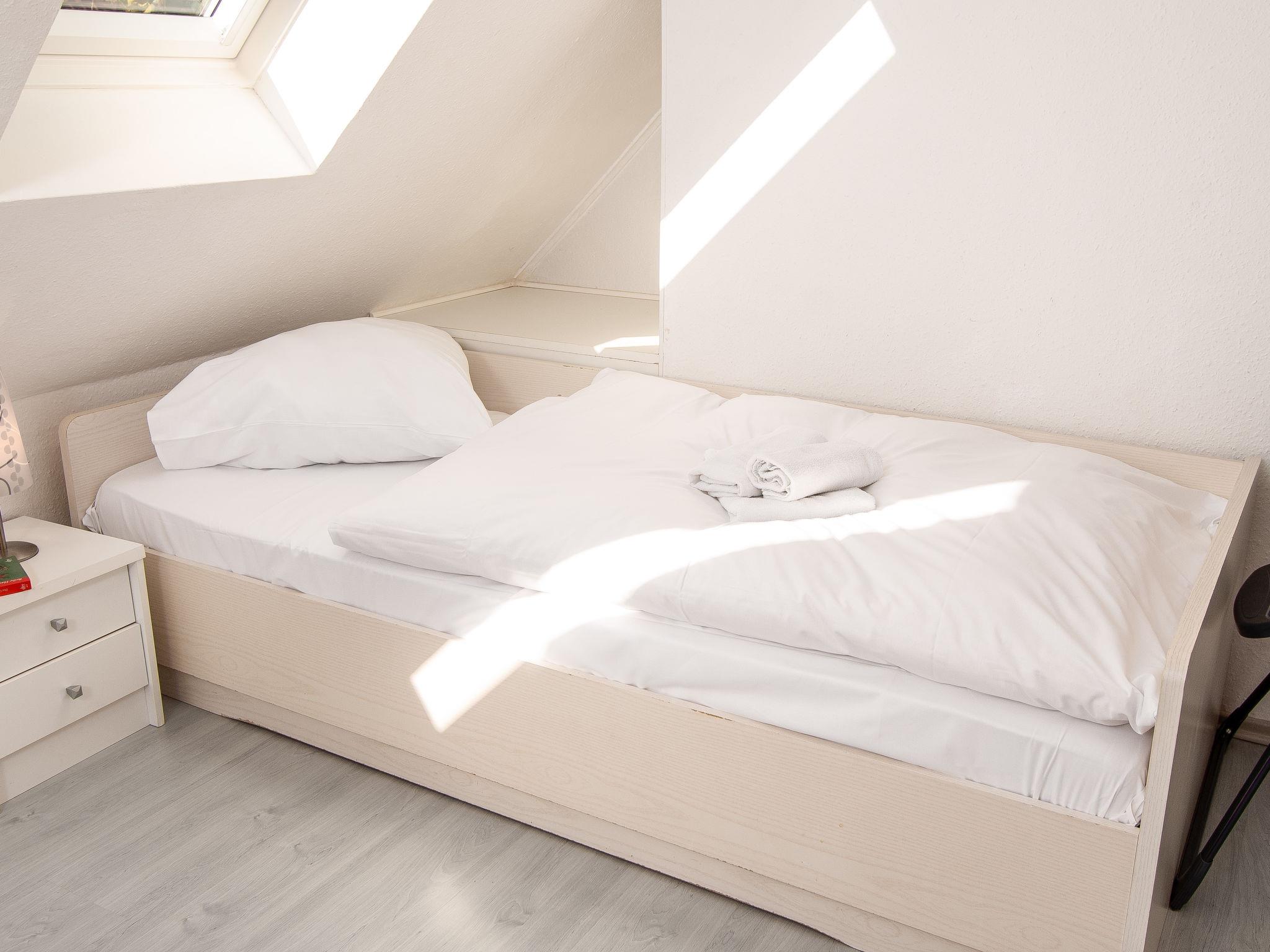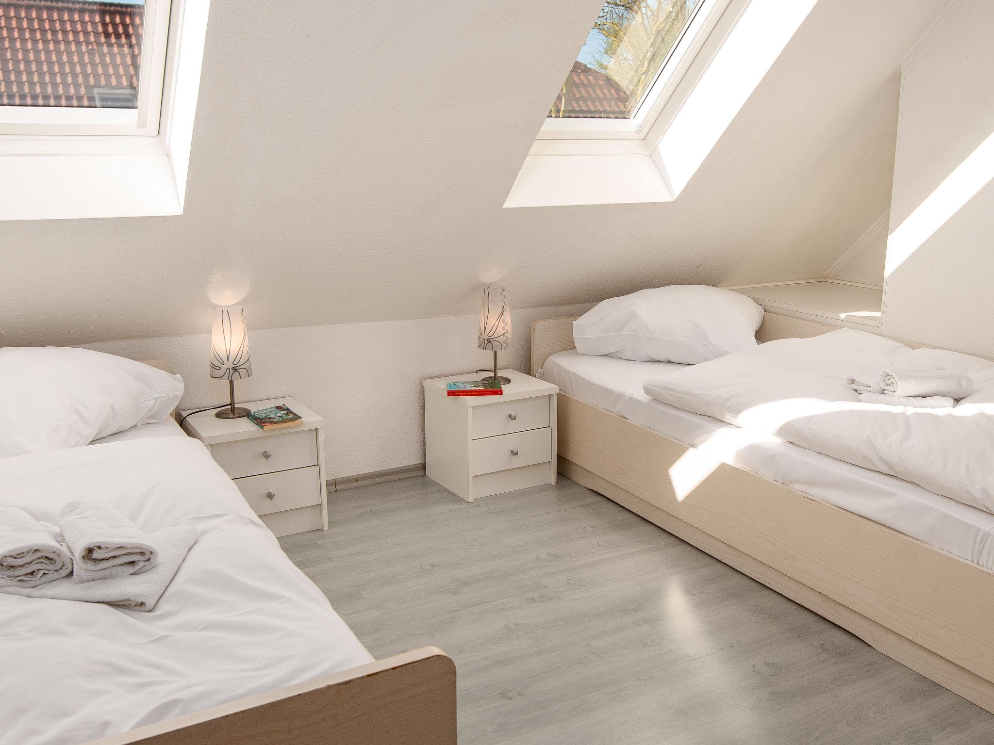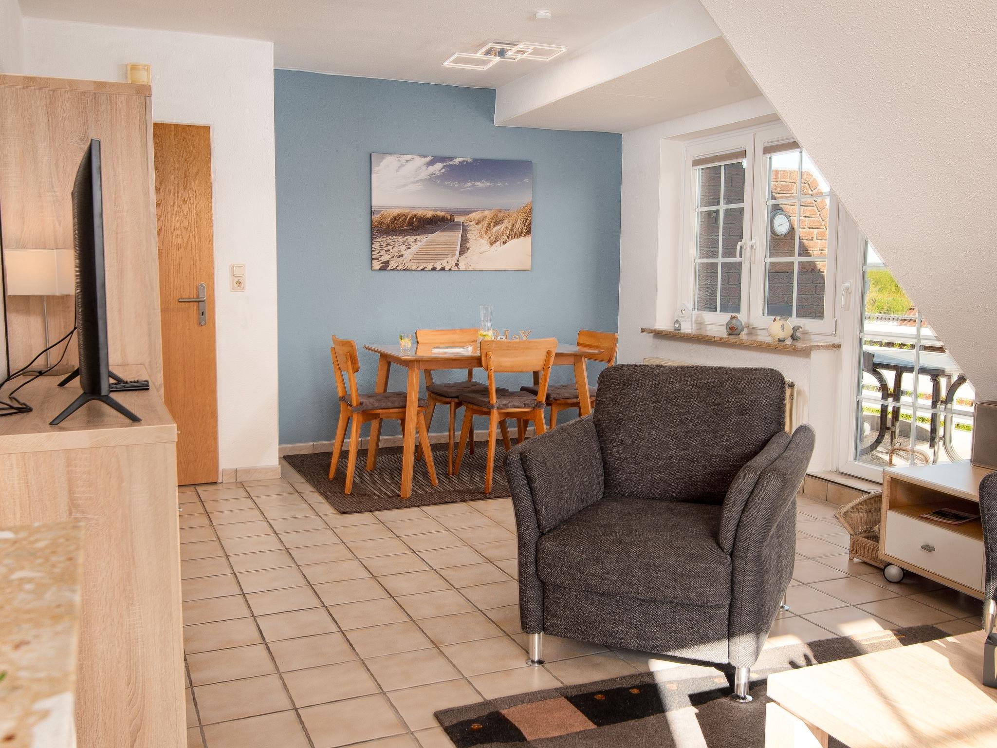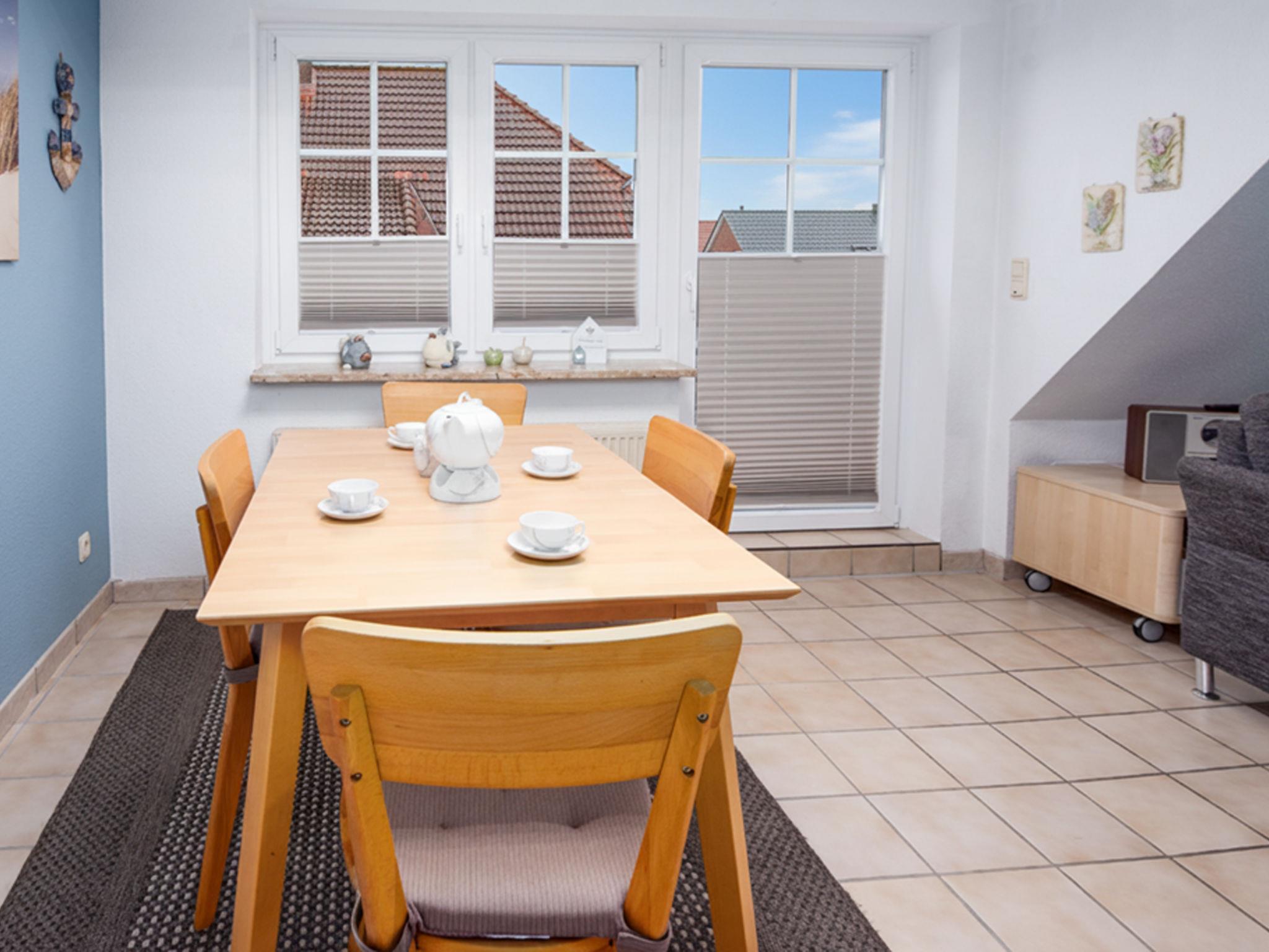 3-room apartment 65 m2, on the upper floor. Bright, partly with sloping ceilings, cosy furnishings: living/dining room 28 m2 with cable TV (flat screen), hi-fi system. Exit to the balcony. 1 room 9 m2 with 1 double bed (2 x 100 cm, length 200 cm). 1 room 8 m2 with 2 beds (90 cm, length 200 cm). Small kitchenette (4 hot plates, oven, dishwasher, toaster, kettle, microwave, electric coffee machine). Shower/WC. Balcony. Balcony furniture. Facilities: iron, children's high chair (extra). Internet (WiFi, free). Please note: non-smokers only. Smoke alarm. DE40827