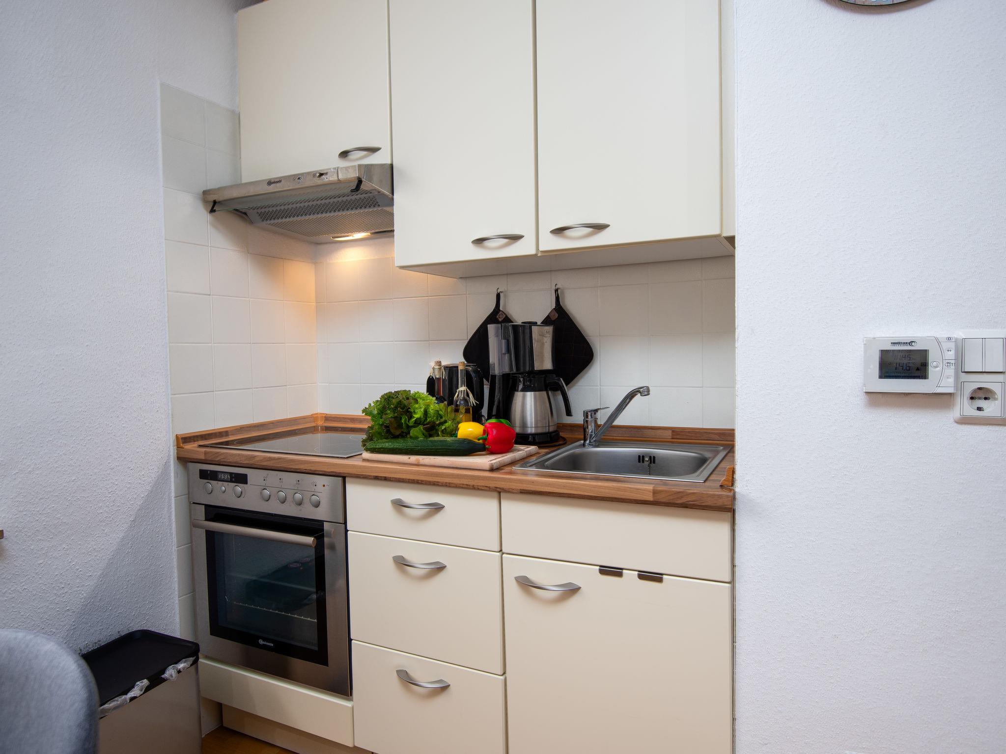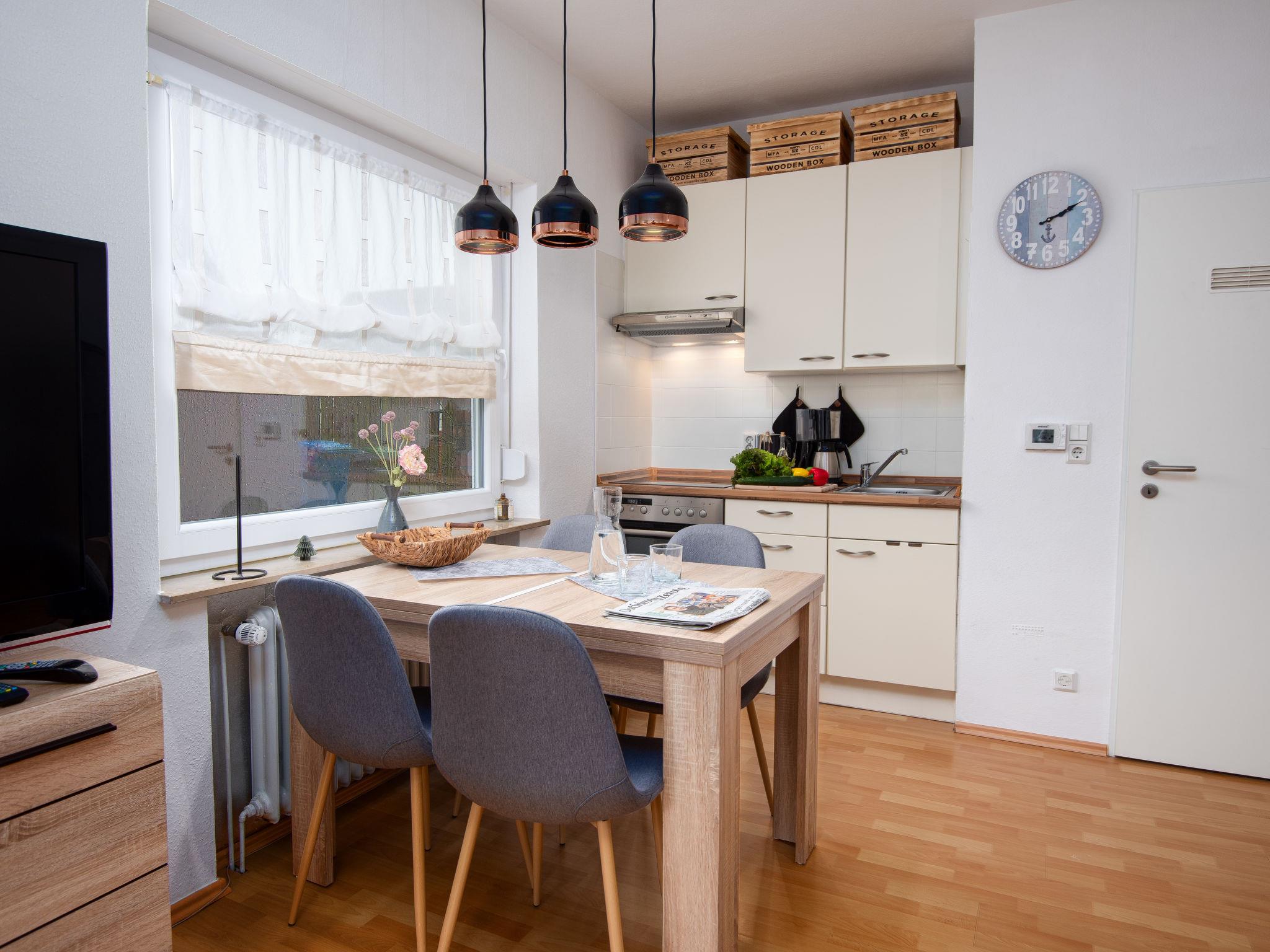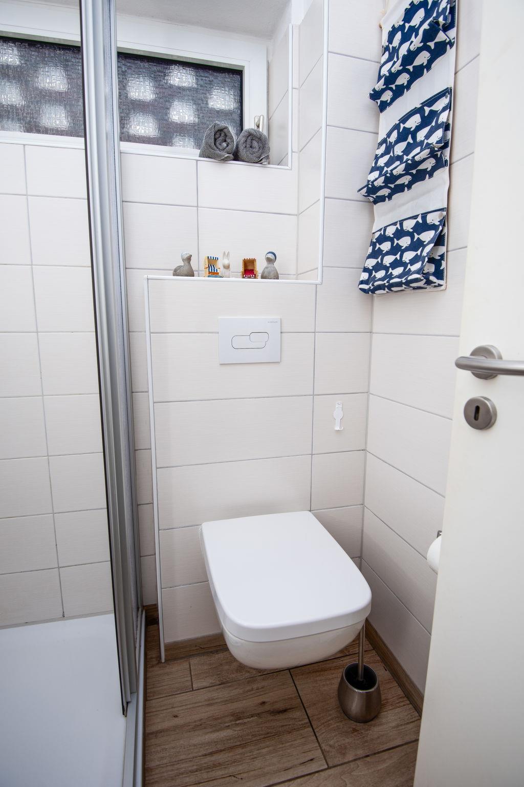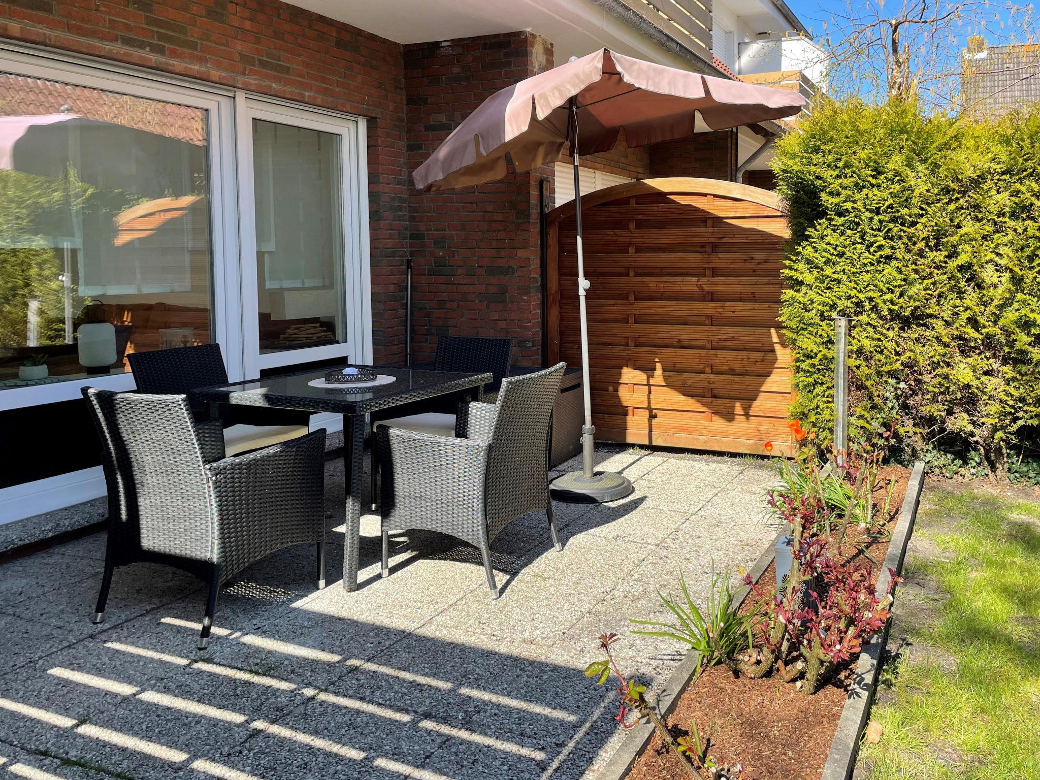 "Meeresrauschen", 2-room apartment 40 m2, on the ground floor. Tasteful furnishings: living/dining room 18 m2 with 1 sofabed and satellite TV (flat screen), radio. Exit to the terrace. 1 room 9 m2 with 1 double bed (2 x 80 cm, length 200 cm). Kitchenette (oven, 4 ceramic glass hob hotplates, toaster, kettle, microwave, freezer, electric coffee machine). Shower/WC. Lawn. Terrace furniture, deck chairs (1). Facilities: washing machine, iron, children's high chair (extra). Internet (WiFi, free). Please note: non-smokers only. Smoke alarm.