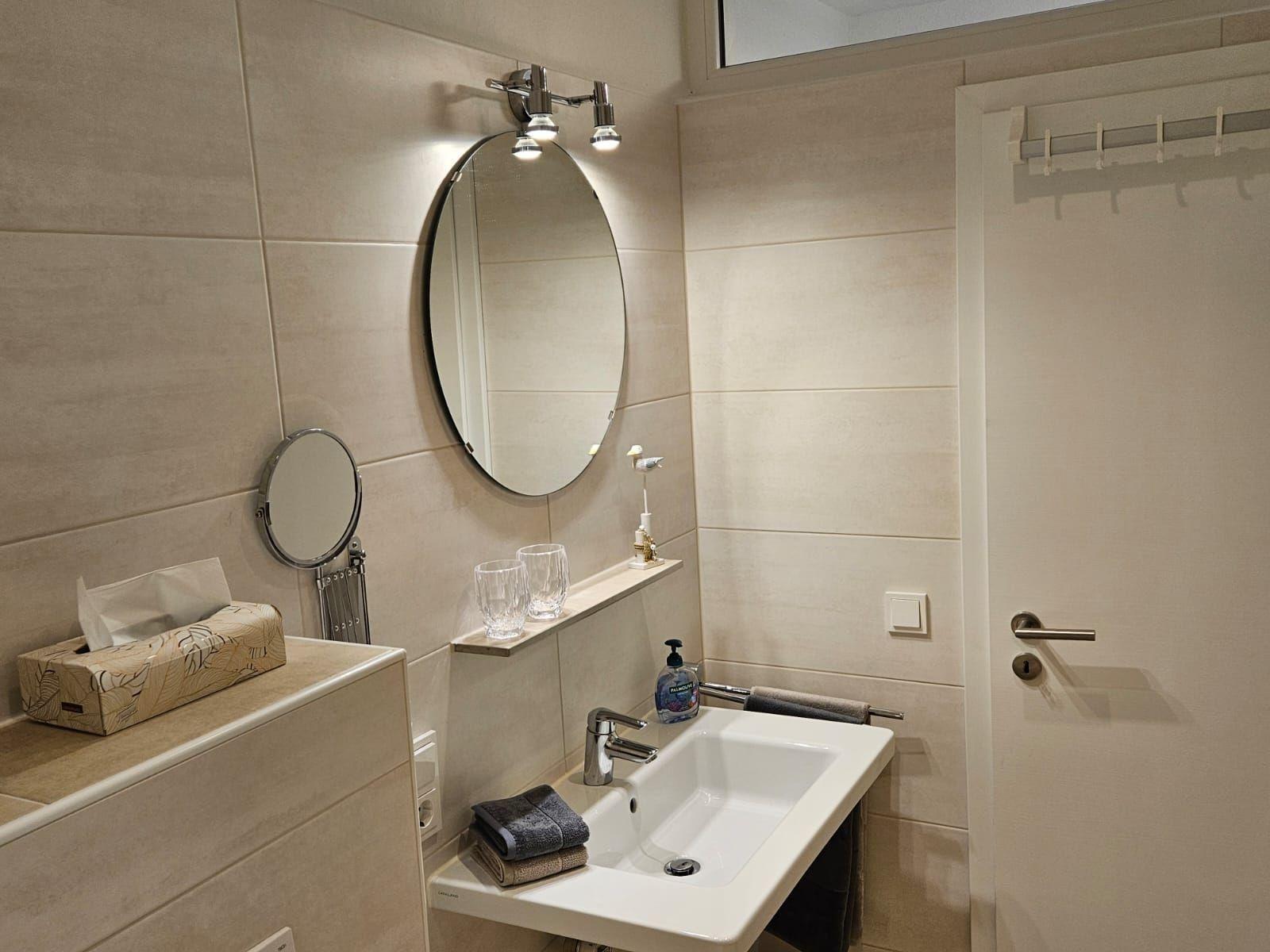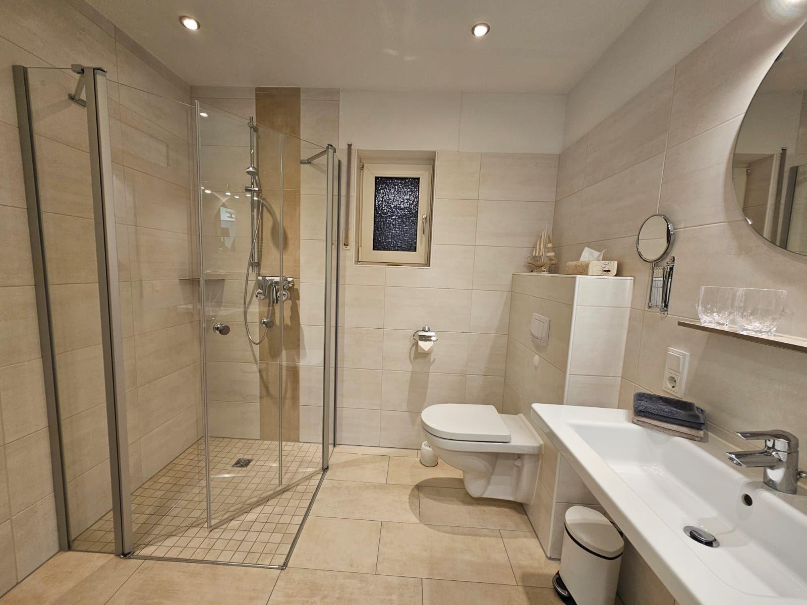 Die Ferienwohnung überzeugt durch ihre großzügige und allergikergeeignete Ausstattung. Sie bietet zwei Schlafzimmer, eines mit einem Doppelbett und ein weiteres mit zwei Einzelbetten. Die offene Küche ist ideal für gemeinsame Kochabende und ist mit einem Geschirrspüler, einem Elektro-/Gasherd, Backofen, Mikrowelle, Kühlschrank sowie einer Kaffeemaschine und einem Toaster ausgestattet. Ein Esstisch lädt zu gemeinsamen Mahlzeiten ein. Das moderne Badezimmer verfügt über eine bodengleiche Dusche, ein Fenster und ein Starterset mit Seife, Duschgel und mehr. Weitere Annehmlichkeiten umfassen WLAN, eine HiFi-Anlage, TV, einen Parkplatz, eine Waschmaschine und einen Wäschetrockner. Für Familien steht ein Kinderhochstuhl bereit. Ein Wohnzimmer mit Sofa und Garderobe sorgt für zusätzlichen Komfort. Pflegeartikel sowie Reinigungsmittel sind ebenfalls vorhanden, um den Aufenthalt so angenehm wie möglich zu gestalten.