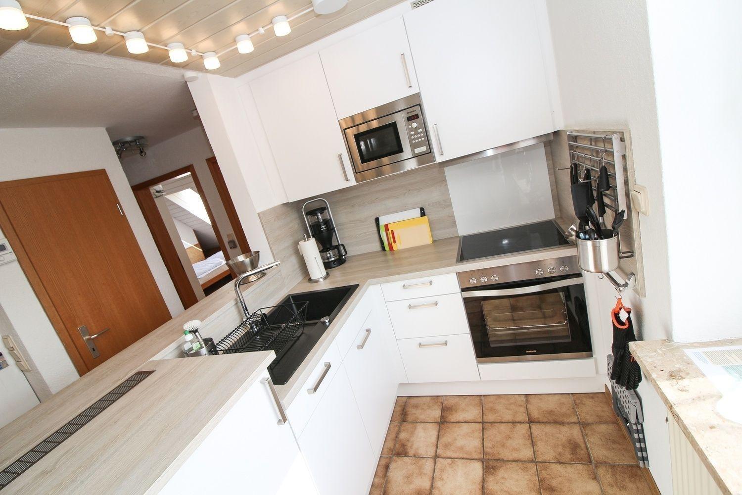 Die neuwertige Küche ist mit einem Herd (Ceranfeld), Backofen, einer Mikrowelle, Kühlschrank mit Gefrierfach und einer Spülmaschine ausgerüstet. Zur weiteren Ausstattung gehören eine Kaffeemaschine, Wasserkocher, Toaster sowie ausreichend Geschirr für 4 Personen.