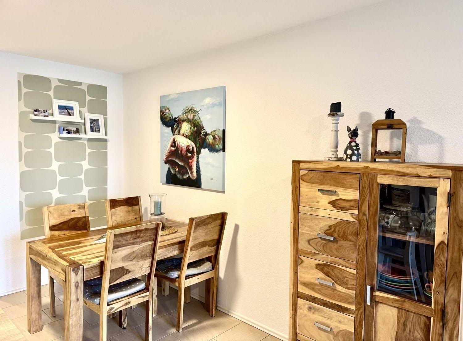 Der Wohn-Essbereich läd zu gemeinsamen Stunden ein. Hier können Sie sich abends vorm Fernseher berieseln lassen, oder sitzen gemütlich auf der Terrassse und lassen ihn dort gemütlich ausklingen. Direkt am Grundstück befindet sich der Kolk mit eigenem Steg.