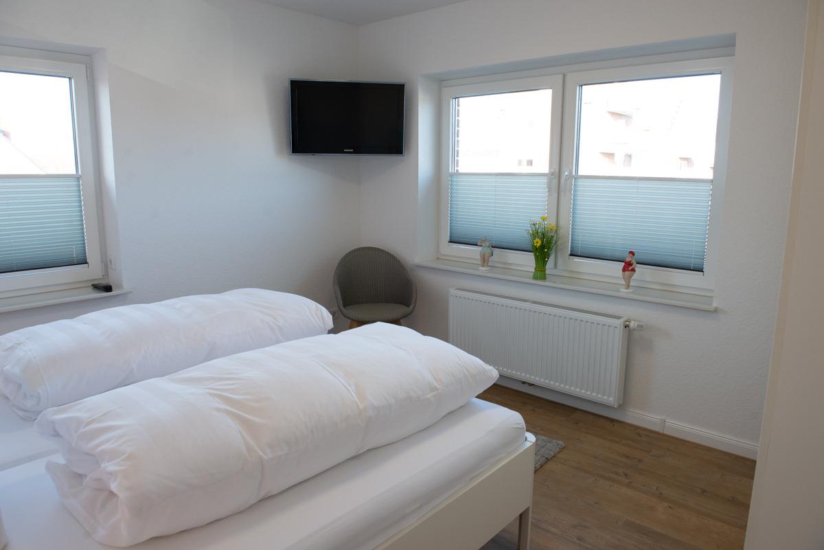 Die Wohnung besitzt 2 getrennte Schlafzimmer, in der gleichen Ebene wie Wohn - Esszimmer und Bad, ein Schlafzimmer mit einem Doppelbett und Fernseher Sat/TV, über eine schöne Holztreppe erreichen Sie das zweite Schlafzimmer, welches mit einem Einzelbett ausgestattet ist. Beide Schlafzimmer besitzen zusätzlich Außenrollläden.