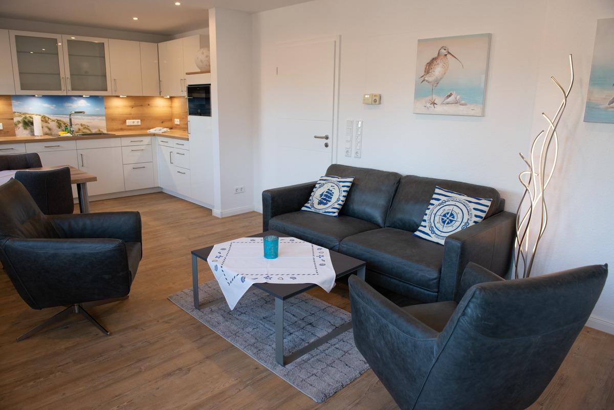 Das große Wohn - Esszimmer, mit integrierter, komplett ausgestatteter Einbauküche, einer Couch und 2 Relax-Sessel und einer gemütlichen Essgruppe, bietet viel Platz. Von hier aus gelangt man auf den schönen Sonnenbalkon, der mit Gartenmöbel und einer Markise ausgestattet ist.