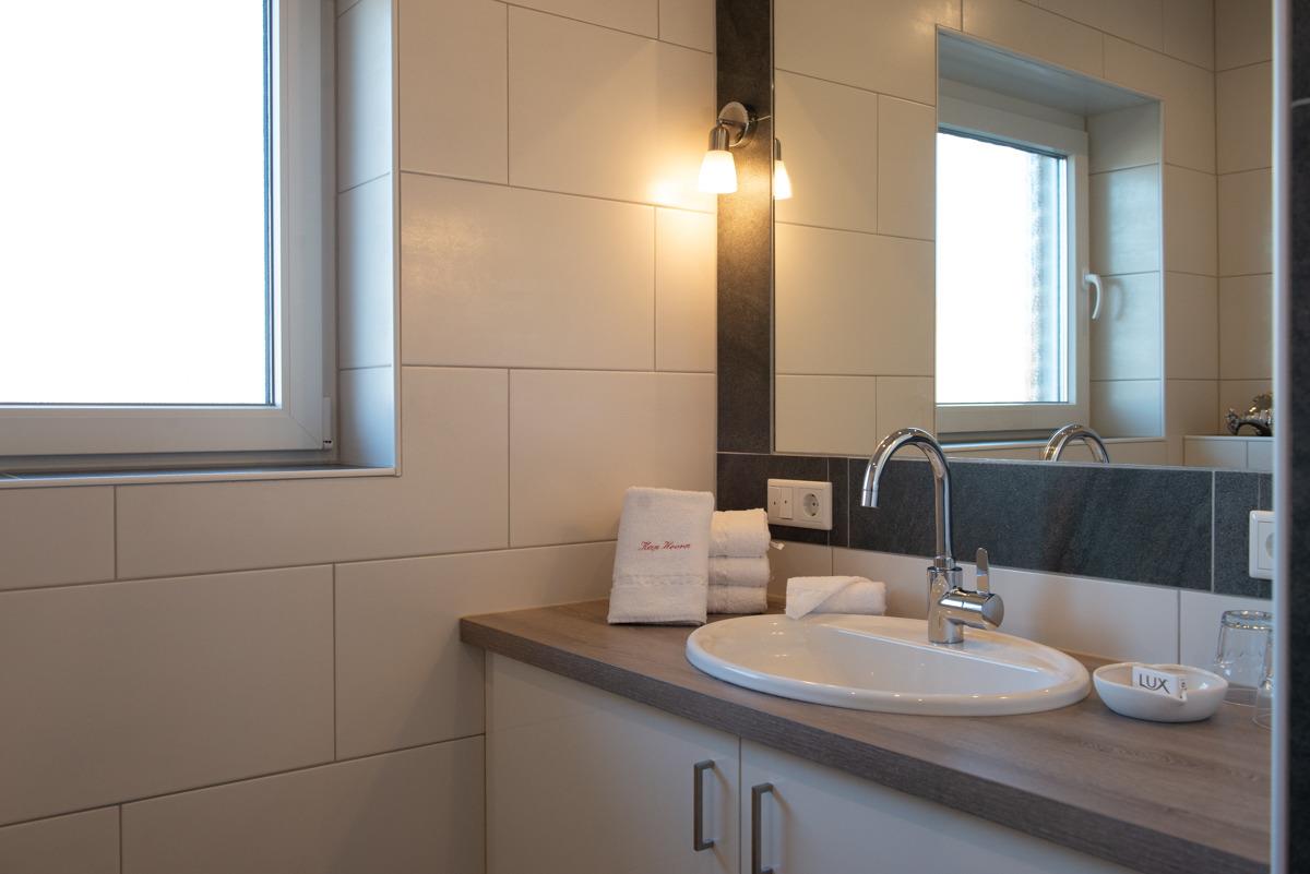 Das moderne Bad/ WC ist mit einer bodenebenen Dusche und einem Einbau -Waschtisch mit großem Spiegel ausgestattet.
