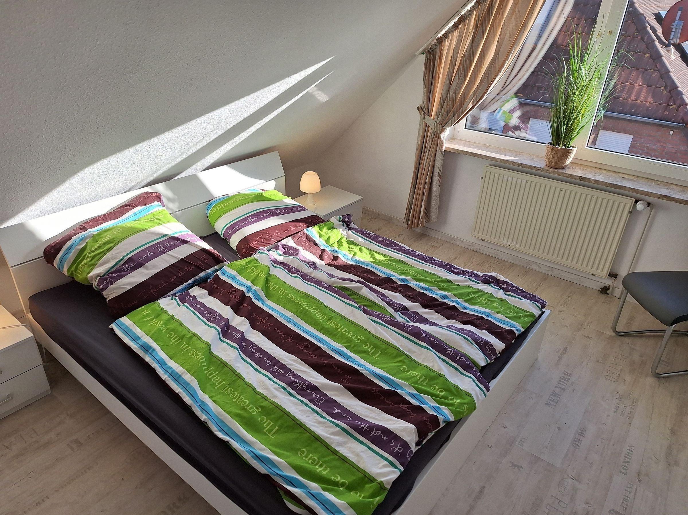 Die modern eingerichtete Ferienwohnung im ersten Obergeschoss eines Mehrfamilienhauses bietet Platz für bis zu 4 Personen. Der offene Wohn- und Essbereich ist mit einer Sofagarnitur sowie einem Kabel-/Smart-TV ausgestattet. Die moderne Küche umfasst ein Cerankochfeld, Geschirrspüler, Backofen und einen Kühlschrank mit Gefrierabteil. Zusätzlich sind Dunstabzugshaube, Kaffeemaschine, Toaster sowie Koch- und Essgeschirr vorhanden. Das Badezimmer, direkt neben dem Schlafzimmer gelegen, verfügt über eine Dusche, WC, Spiegel und Waschbecken. Das Schlafzimmer ist mit einem Doppelbett (1,80 x 2 m) und einem geräumigen Einbaukleiderschrank ausgestattet. In der darüberliegenden Etage befindet sich ein offener Schlafraum mit zwei Einzelbetten (Futon 1,40 x 2 m) sowie eine Waschmaschine. Zu den Gemeinschaftseinrichtungen zählen ein Stellplatz für ein Pkw und ein gemeinschaftlicher Fahrradraum. Bettwäsche und Handtücher sind nicht im Preis enthalten. Ein Hund ist willkommen, Katzen sind nicht gestattet.