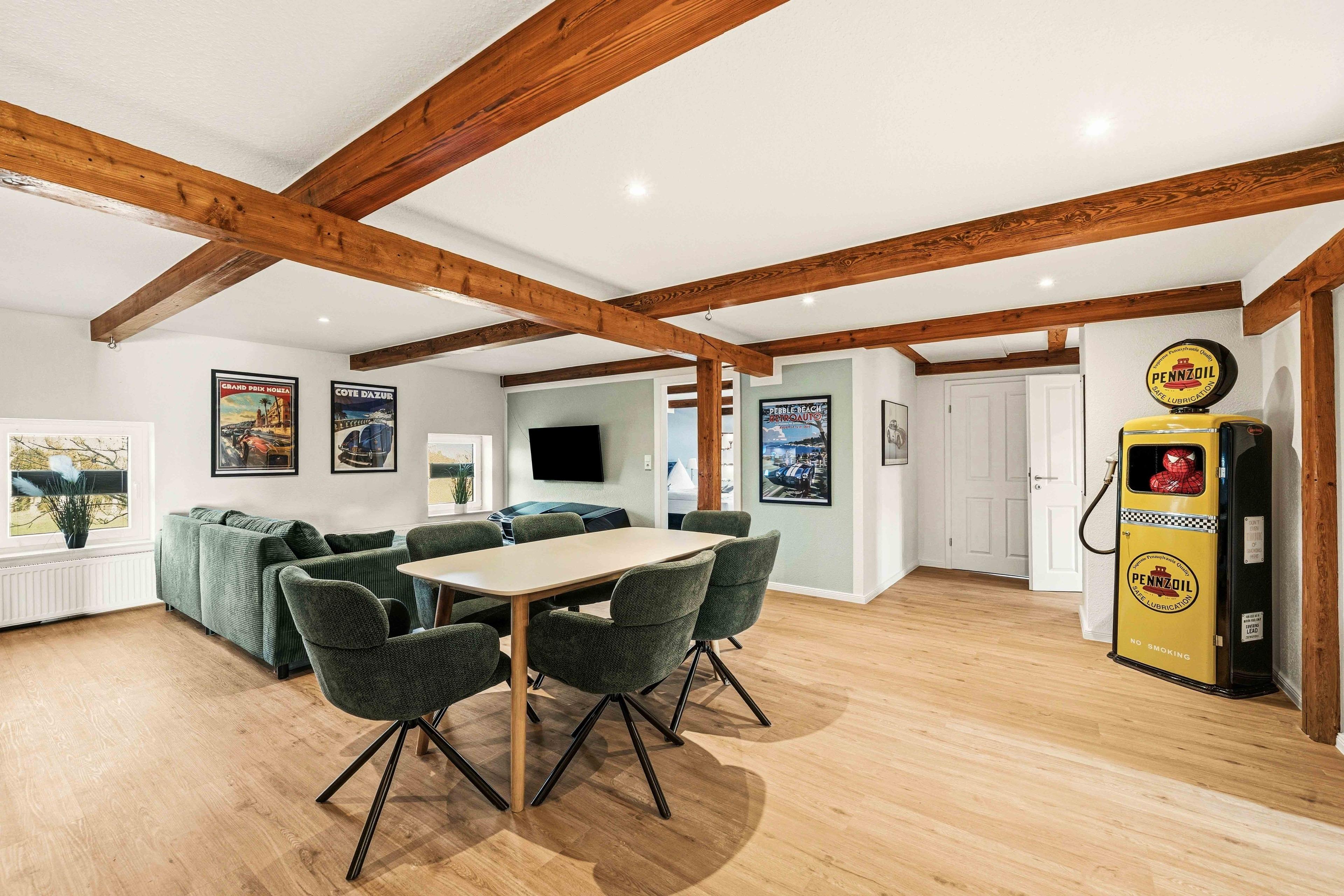 Die Ferienwohnung „Boxenstop“ in Norddeich ist weit mehr als eine gewöhnliche Unterkunft – sie ist ein liebevoll gestaltetes Erlebnis für alle, die ein besonderes Ambiente schätzen. Gelegen in der Ostermarscher Straße 29, direkt über dem Automuseum, greift die Wohnung ihre außergewöhnliche Lage thematisch auf: Die gesamte Einrichtung und Dekoration ist mit viel Liebe zum Detail im automobilen Stil gestaltet und macht den Aufenthalt zu etwas ganz Besonderem. Die im Obergeschoss gelegene Wohnung bietet auf großzügigen 100qm reichlich Platz für Familien oder Freunde. Drei Schlafzimmer sorgen für komfortable Übernachtungsmöglichkeiten: Zwei Zimmer sind mit gemütlichen Doppelbetten ausgestattet, während das dritte Schlafzimmer mit einem Hochbett besonders bei Kindern sehr beliebt ist. Das moderne Tageslichtbad überzeugt mit einer ebenerdigen Dusche, einem Doppelwaschbecken und viel Platz für einen entspannten Start in den Tag. Ein zusätzlicher Abstellraum bietet praktischen Stauraum für Gepäck und persönliche Dinge. Das Herzstück der Wohnung ist der großzügige Wohn- und Essbereich. Die sichtbaren Holzbalken verleihen dem Raum eine warme und gemütliche Atmosphäre. Hier finden Sie eine hochwertige Küchenzeile, eine komfortable Sofalandschaft zum Entspannen sowie einen großen Esstisch für gemeinsame Mahlzeiten. Auch in diesem Bereich wird das Automobil-Thema durch besondere Design-Elemente und liebevolle Details stilvoll aufgegriffen. Durch die ruhige, ländliche Lage etwas außerhalb von Norddeich ist die Ferienwohnung „Boxenstop“ der ideale Ort, um nach einem erlebnisreichen Tag zur Ruhe zu kommen – komfortabel, stilvoll und mit einem außergewöhnlichen, thematischen Konzept.