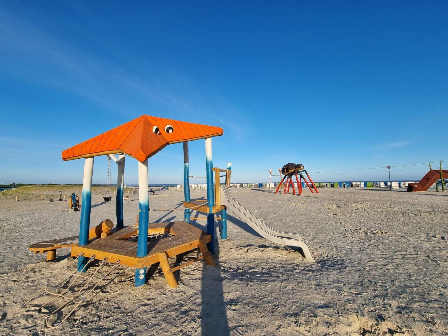 Sandstrand und Nordsee mit Strandkörben und Spielmöglichkeiten