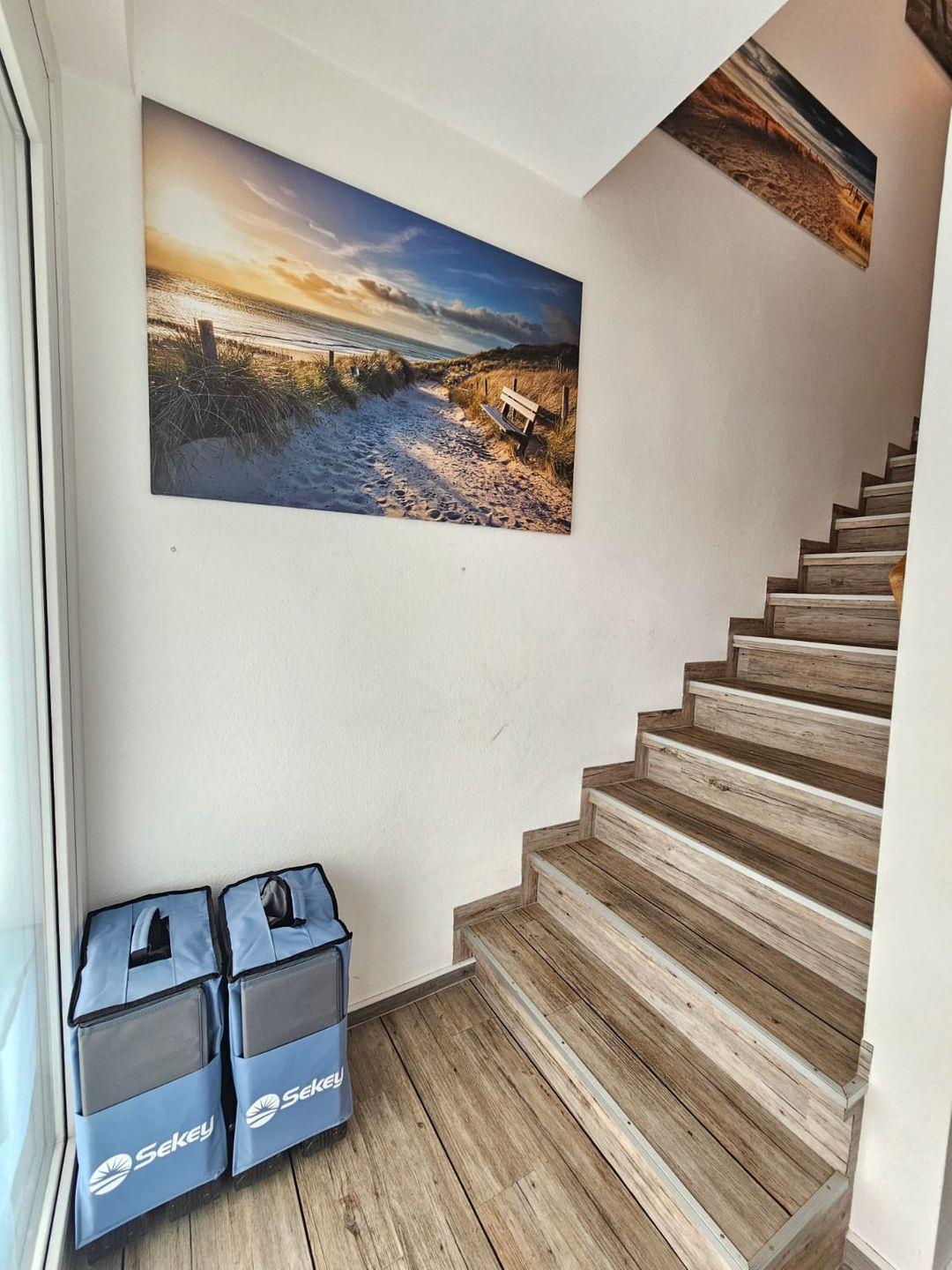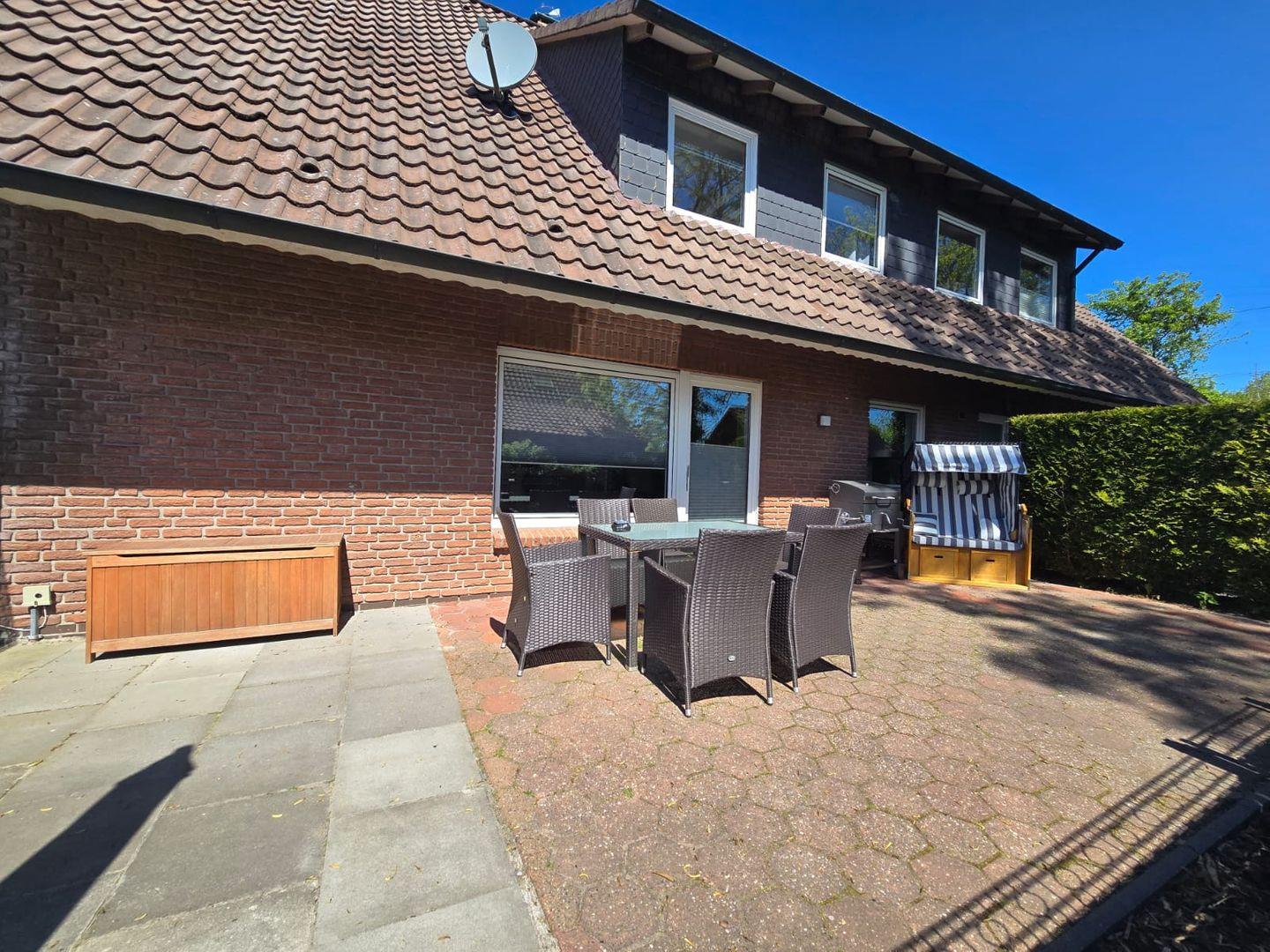 Ein besonderes Highlight der Wohnung ist die große Terrasse, auf der ein eigener Strandkorb für entspannte Stunden an der frischen Nordseeluft sorgt. Ob Frühstück in der Morgensonne oder gemütliche Grillabende am Abend – die Terrasse bietet den perfekten Rückzugsort im Freien. Ein moderner Grill steht für gemeinsame Abende mit Familie oder Freunden bereit.