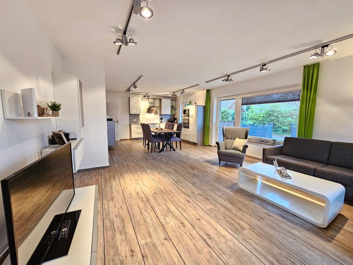 Der großzügige, offene Wohn- und Essbereich lädt zum Entspannen und geselligen Beisammensein ein. Die stilvolle Einrichtung sorgt für Wohlfühlatmosphäre, während große Fenster viel Tageslicht hereinlassen und einen Blick ins Freie bieten. Ein moderner Esstisch bietet Platz für alle Gäste und schafft den idealen Rahmen für gemeinsame Mahlzeiten.