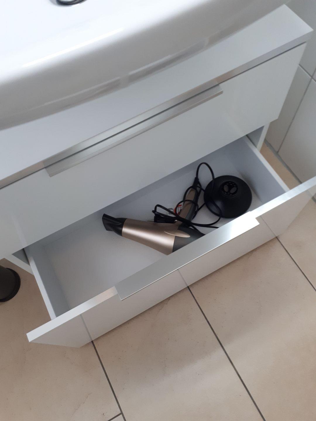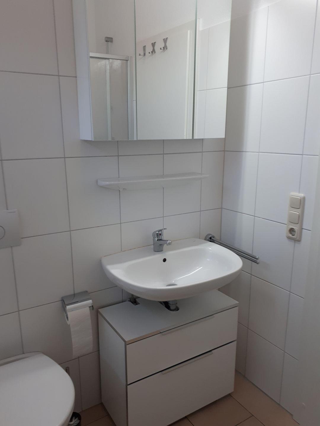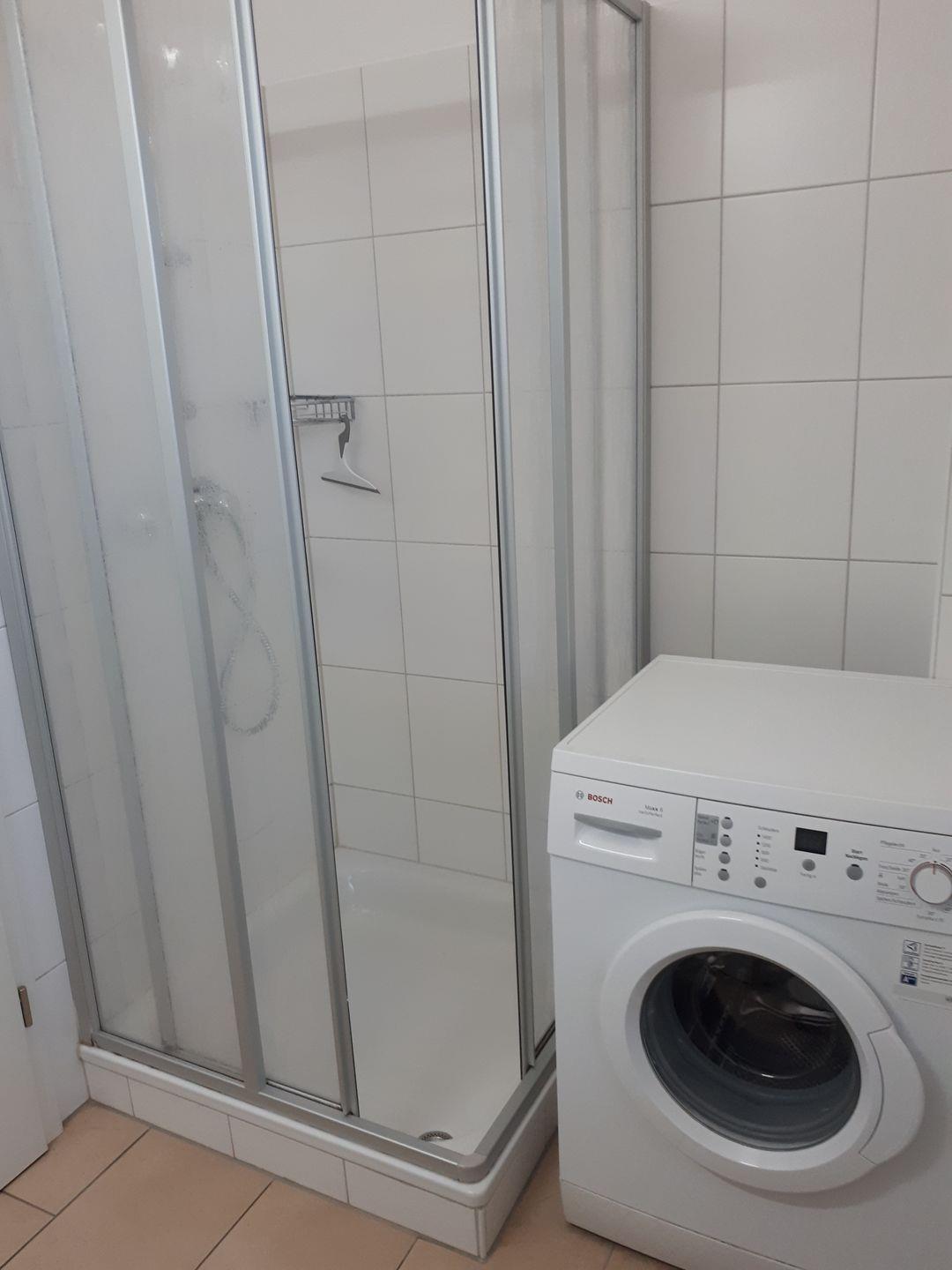 Das Duschbad ist mit Hänge-WC, Waschmaschine und Föhn ausgestattet. Es gibt ein Bügelbrett und Bügeleisen.