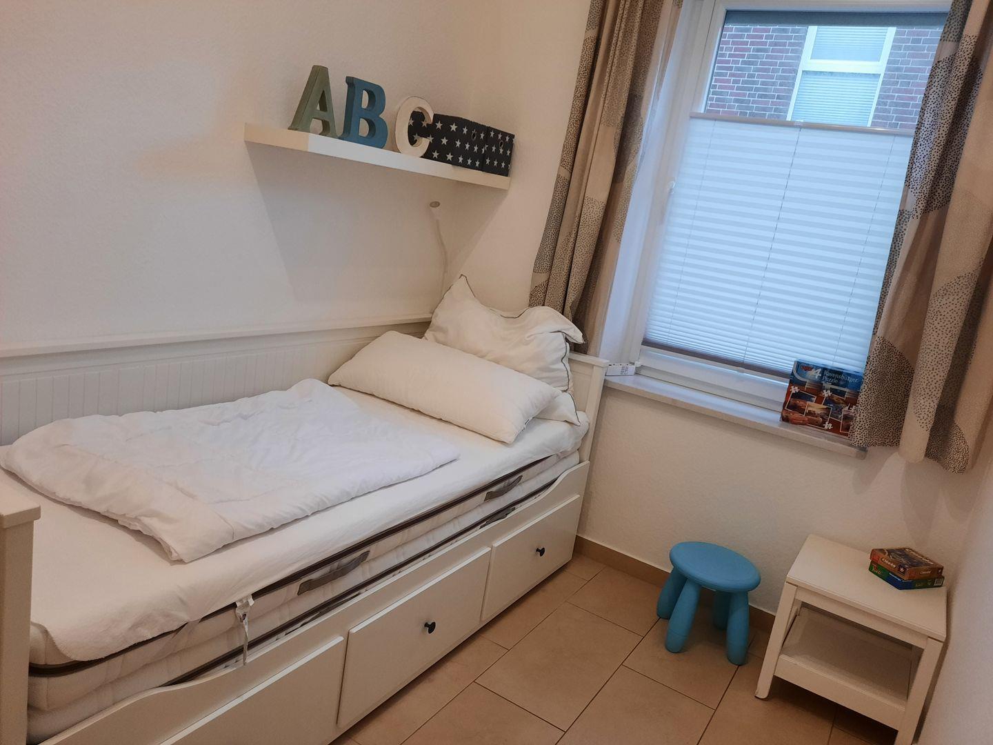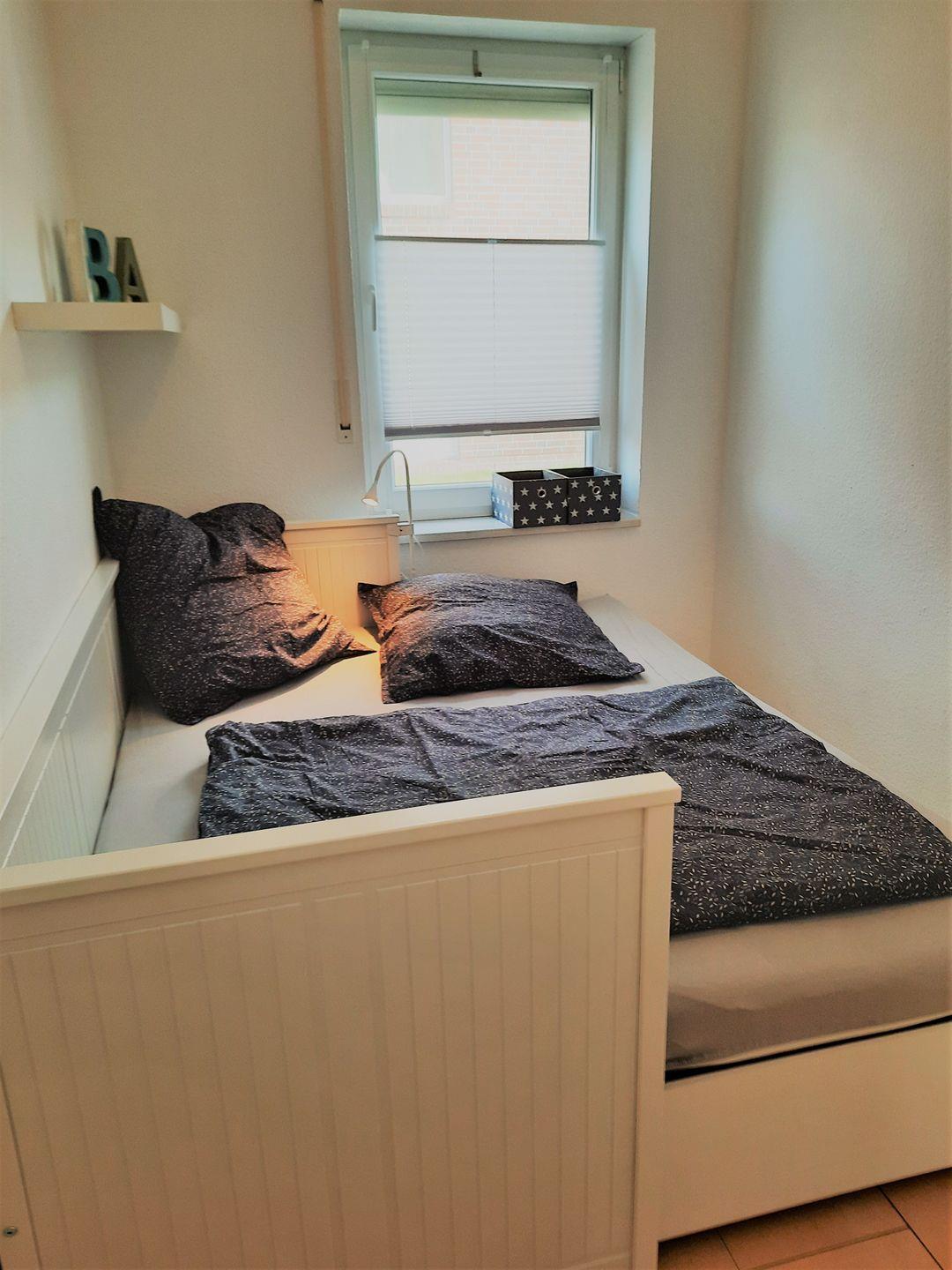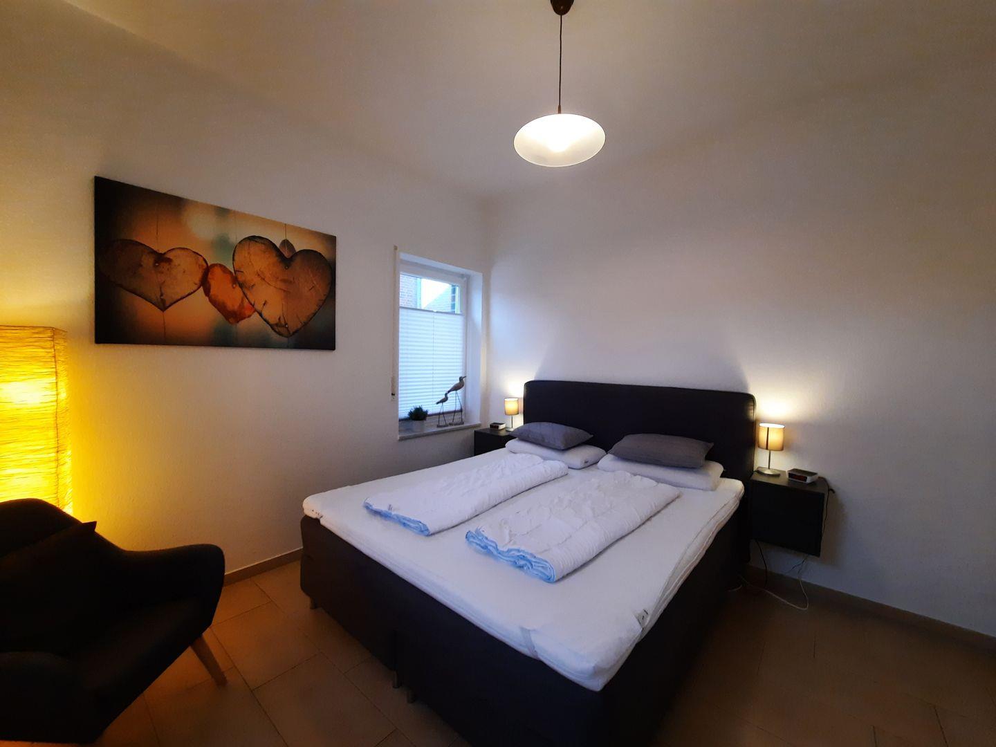 Die Wohnung verfügt über zwei Schlafzimmer. Im Elternschlafzimmer steht u. a. ein Boxspringbett (1,80 x 2,00 m) für einen erholsamen Schlaf bereit.
