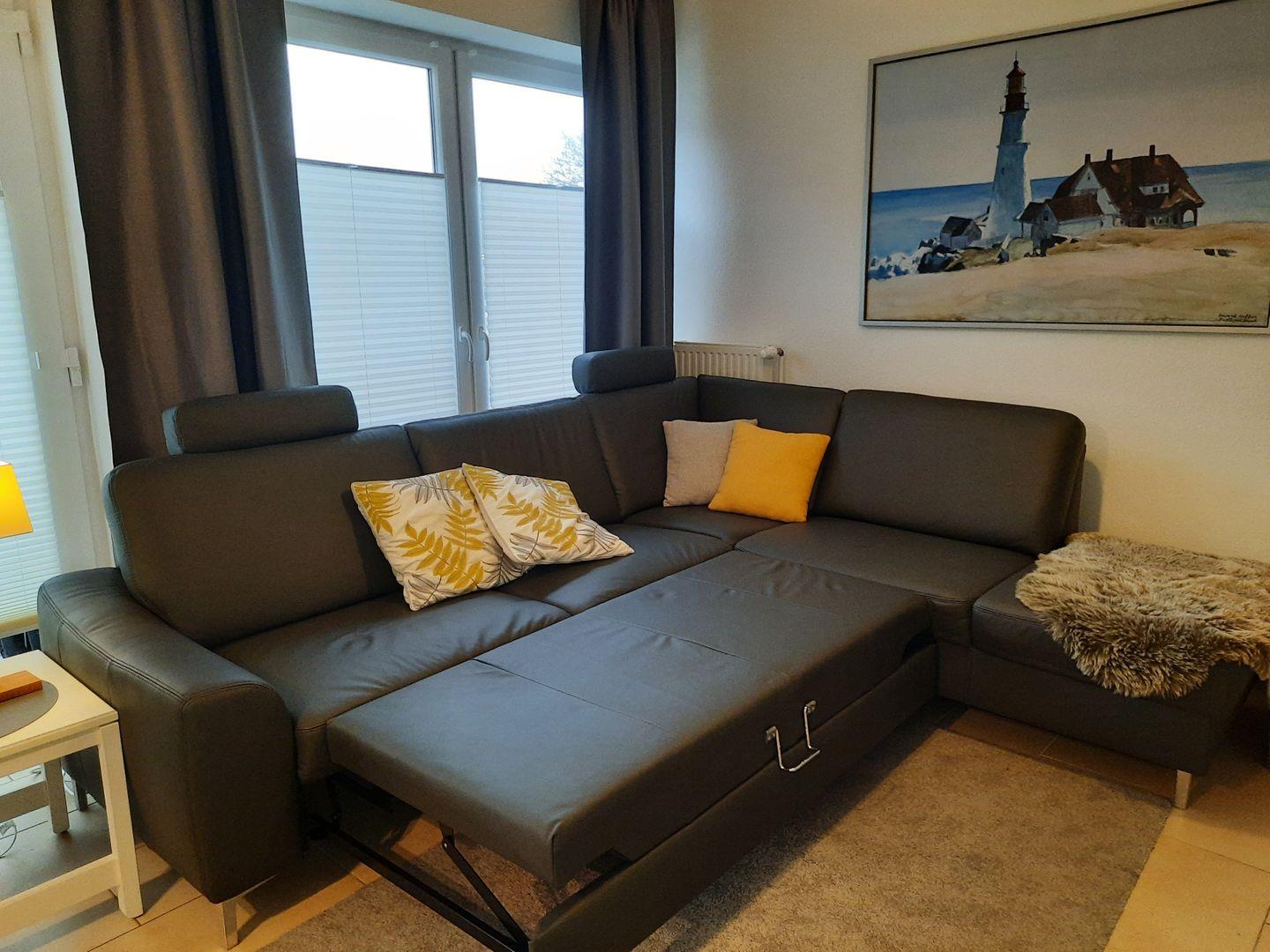 Großer Wohn-/Essbereich mit gemütlicher neuer Couchgarnitur aus Leder inklusive Schlaffunktion sowie voll ausgestatteter Küche mit z.B. Gefrierfach, Geschirrspüler, Mikrowelle, Wasserkocher, Kaffeemaschine, Toaster, etc.,