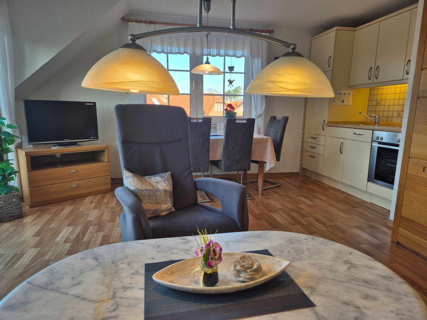 Der gemütliche Wohnbereich lädt dazu ein, anzukommen und durchzuatmen. Eine bequeme Sofaecke mit Sofa und Sessel bietet Raum für entspannte Abende, Gespräche oder einen Film. Am Esstisch können Sie gemeinsam frühstücken, Ausflüge planen oder den Tag in geselliger Runde ausklingen lassen. WLAN steht selbstverständlich zur Verfügung, sodass Sie auch im Urlaub flexibel bleiben.