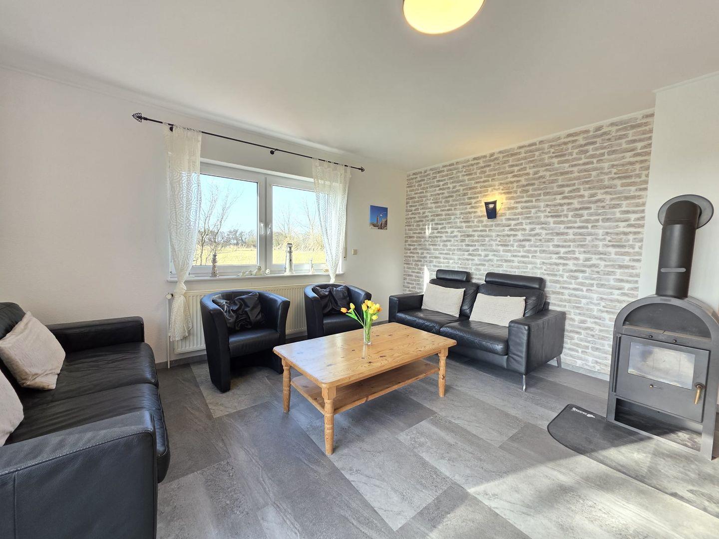 Helles, offenes Wohn- & Esszimmer: Mit Kaminofen für gemütliche Stunden an kühlen Abenden.