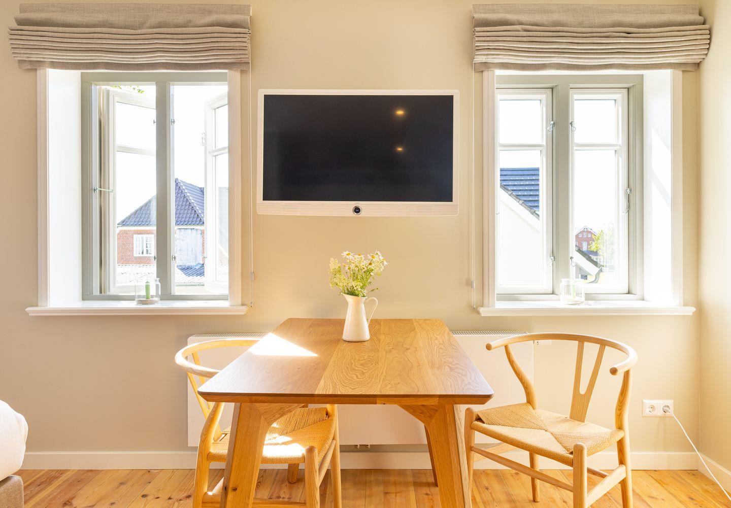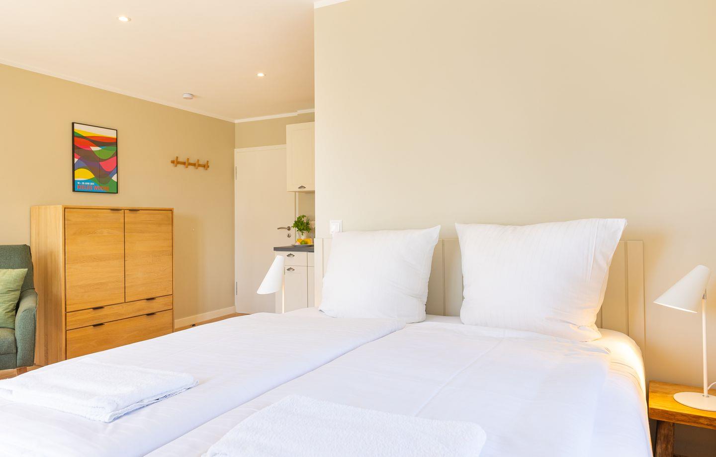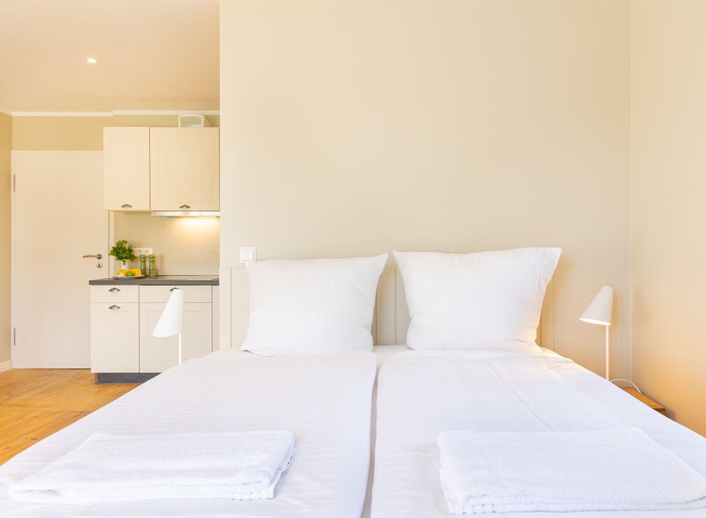 Diese 25qm² große Einraumwohnung 5 liegt im ersten OG. Sie ist hell und geschmackvoll eingerichtet und bietet Ihnen vom ersten Tag an Erholung. Sie ist mit skandinavischen und hochwertigen Möbeln die Wohlfühloase Ihrer Amrumzeit. Im Wohn- und Essbereich ist eine Küche integriert. Der Wohnbereich mit TV und einem Sessel sowie einem 1,60 m breiten Boxspringbett ausgestattet.
