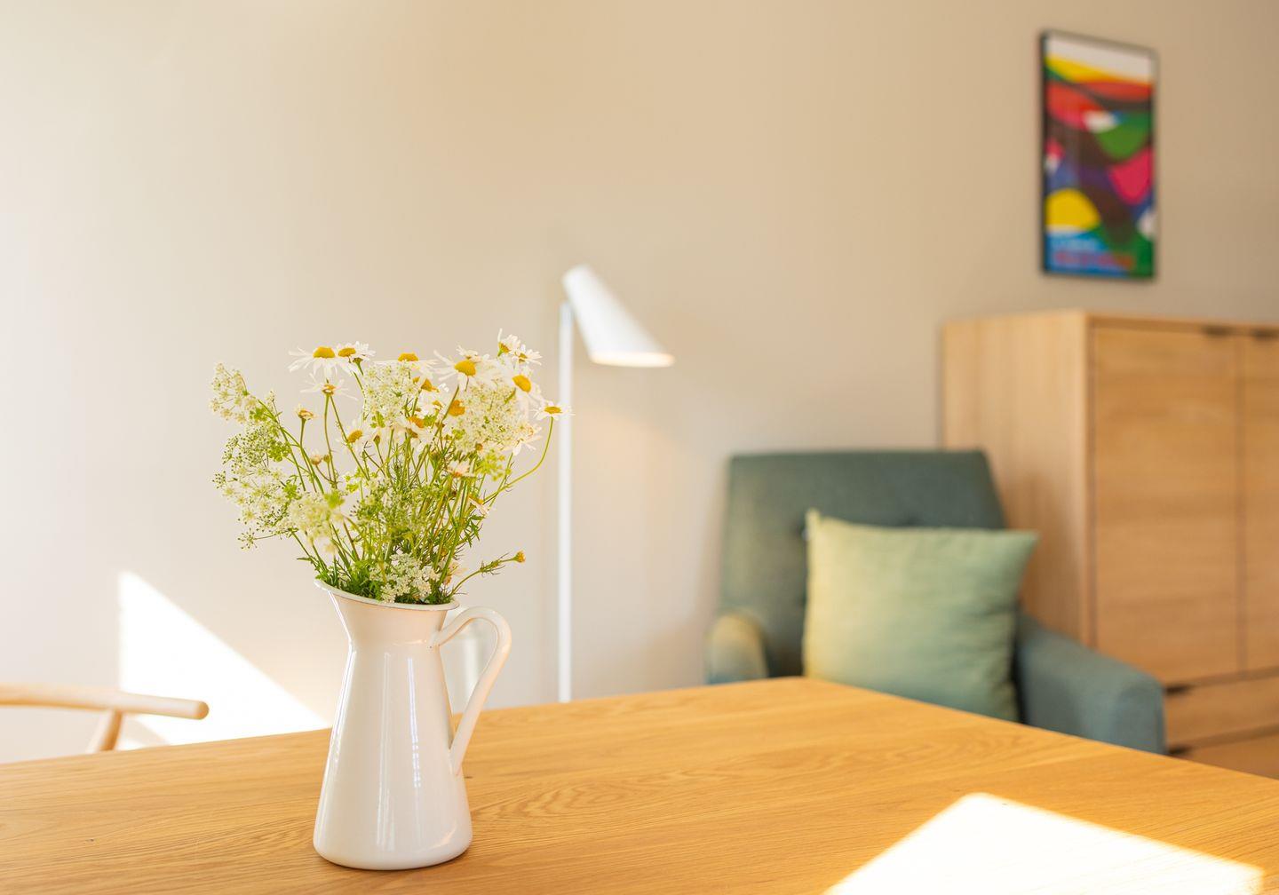 Diese 25 qm² große Einraum-Wohnung 5 liegt im ersten Obergeschoß des Hauses. Sie ist hell und geschmackvoll eingerichtet und wird Ihnen vom ersten Tag an Erholung bieten. Diese elegant, im nordischen Stil gestaltete Ferienwohnung ist ein optimaler Ausgangspunkt für Ihre Aktivitäten. Sie ist mit ihren skandinavischen und hochwertigen Möbeln die Wohlfühloase Ihrer Amrumzeit. Hier erwartet Sie ein Wohnraum mit einem 1,60m großem Boxspringbett und dem Wohn- und Essbereich. Die Küchenzeile befindet sich ebenfalls im Wohnraum. Die Küche ist mit allen Utensilien ausgestattet. Der Wohnbereich mit TV und einem Sessel lädt zu erholsamen Stunden ein.