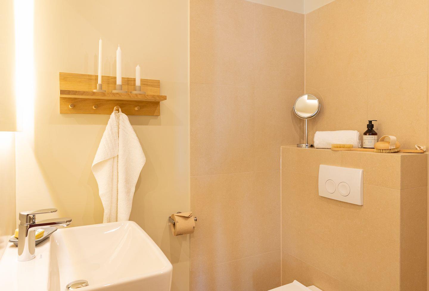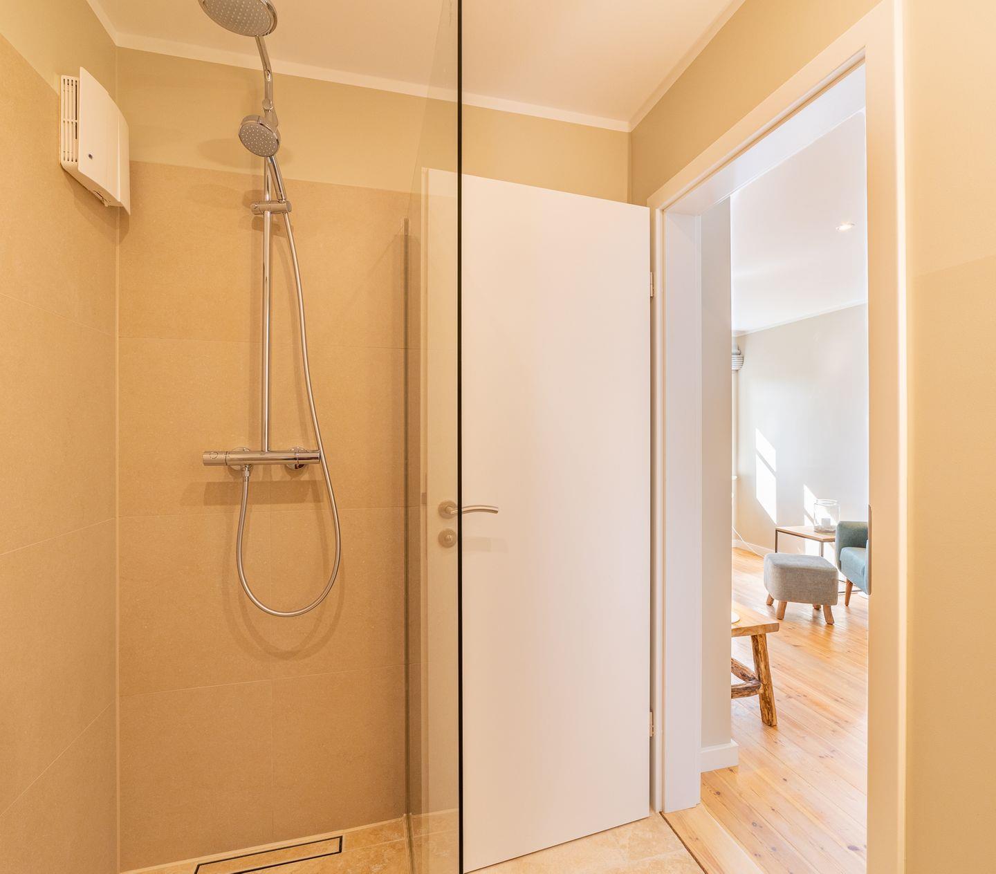 Das neue Bad ist mit hellem Naturstein gefliest. Die offene bodentiefe Regendusche ist begehbar und hat eine gläserne Seitenwand.
