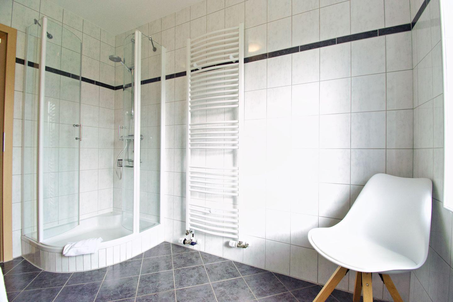 Das Badezimmer ist mit einer Dusche, einem Haartrockner und einem Handtuchheizkörper ausgestattet.