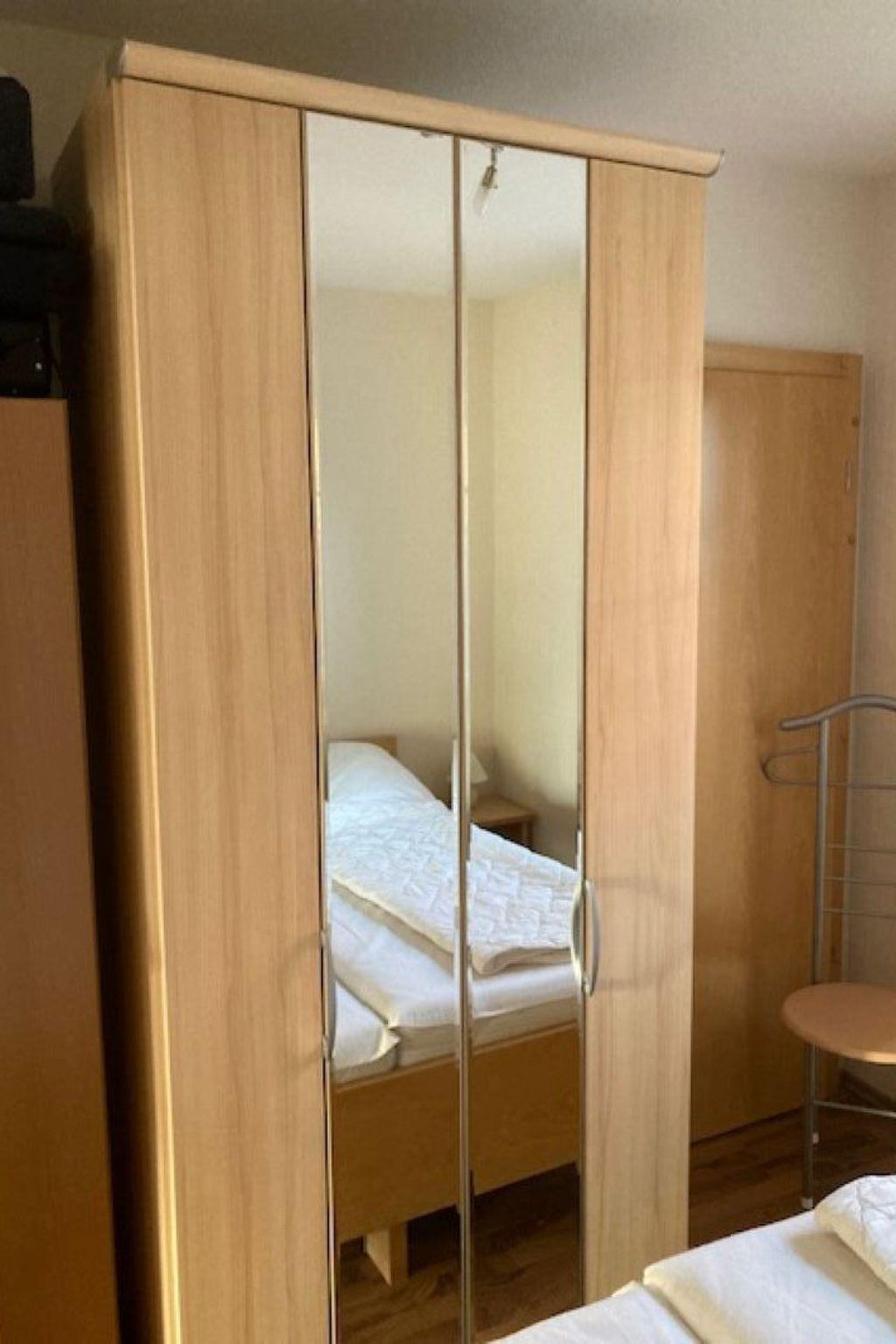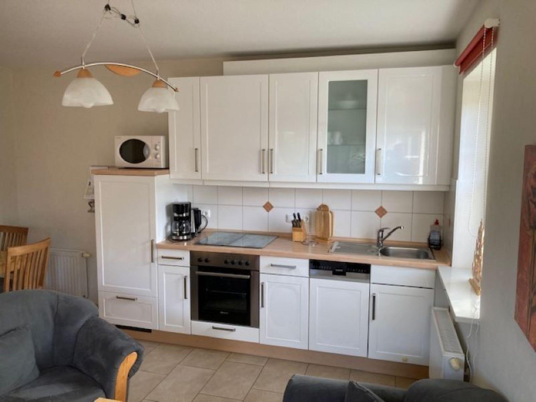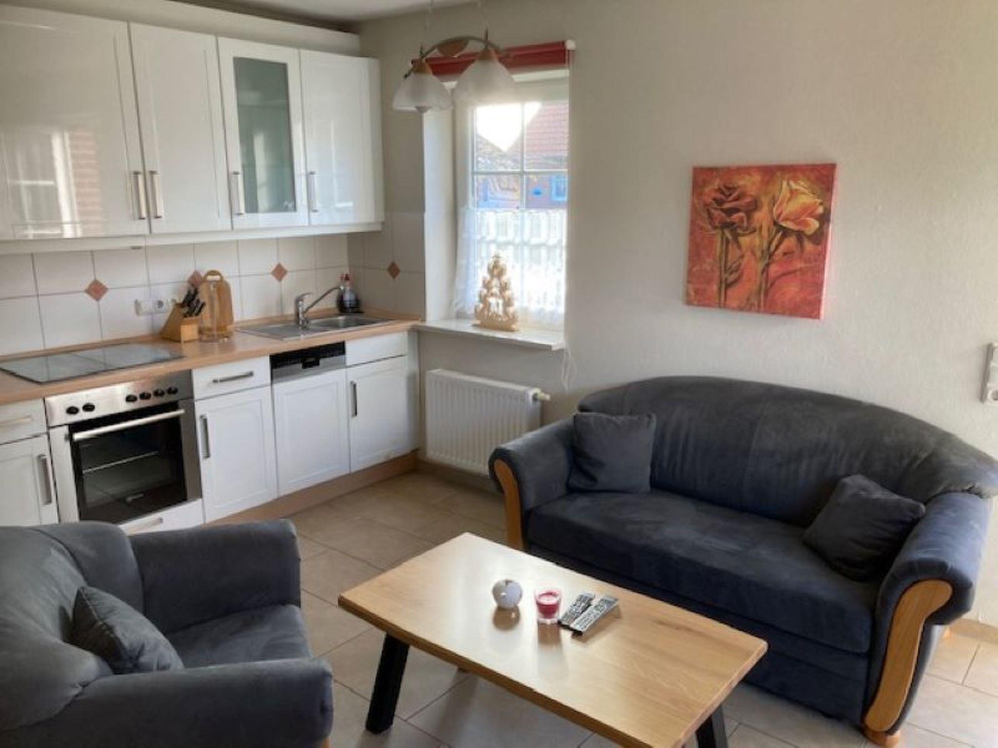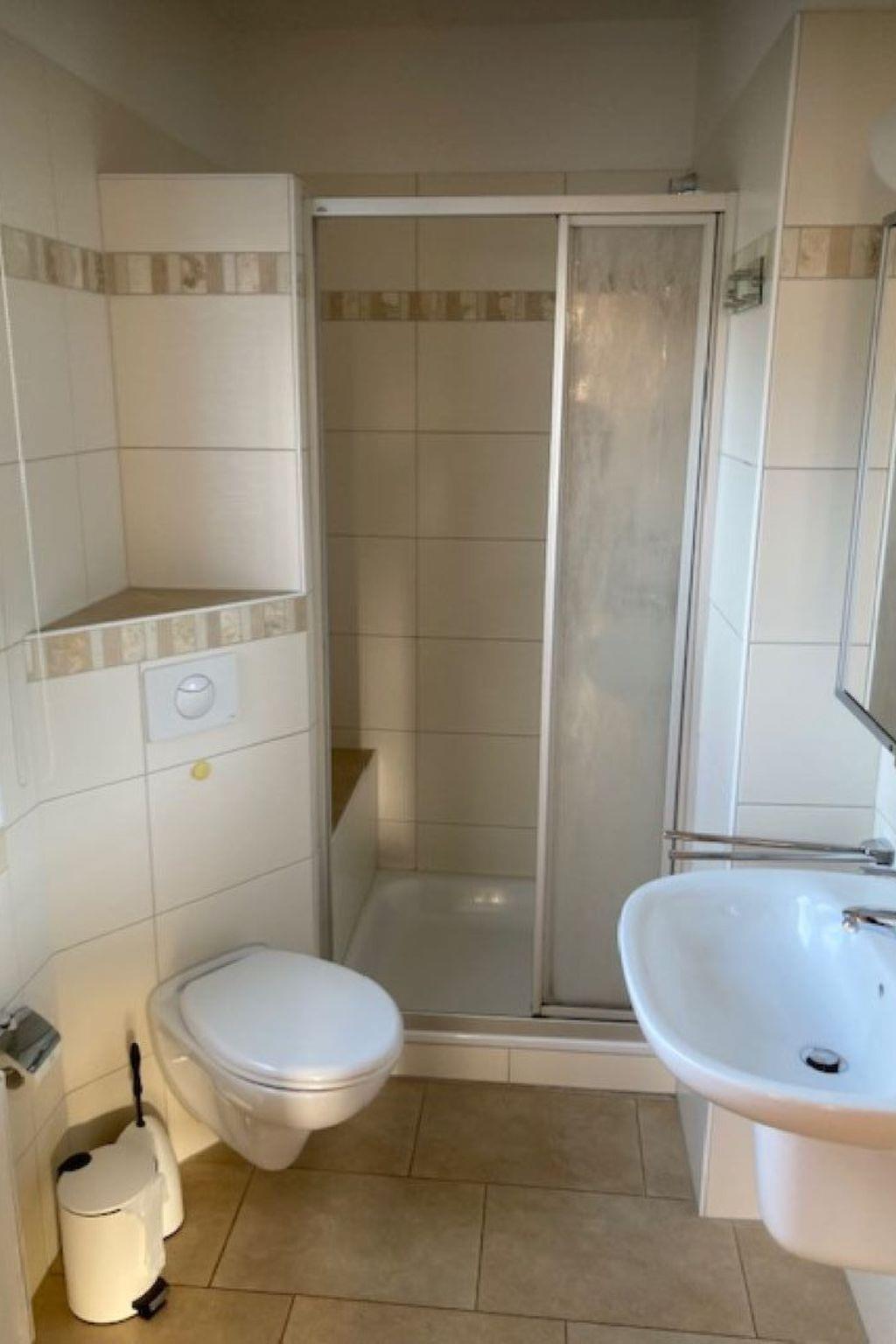 For rent is a small holiday flat with a bedroom, a shower room and a living area. the bedroom is equipped with a 1,80x2,00m bed as well as a wardrobe and two bedside tables. in the bathroom there is a shower, a toilet, a washbasin, underfloor heating and radiators. the larger living area offers a fully equipped kitchen with dining area, seating area and TV corner. outside the flat still offers a sitting area with garden chairs and also a nice wooden bench. parking is directly at the property.