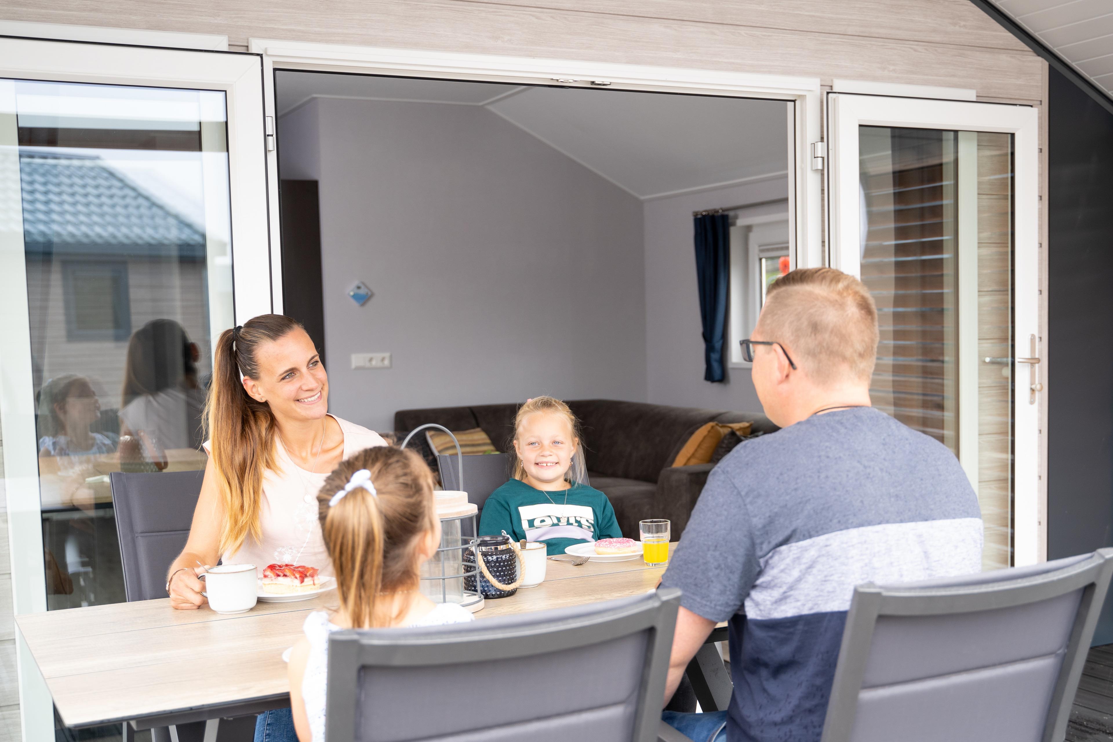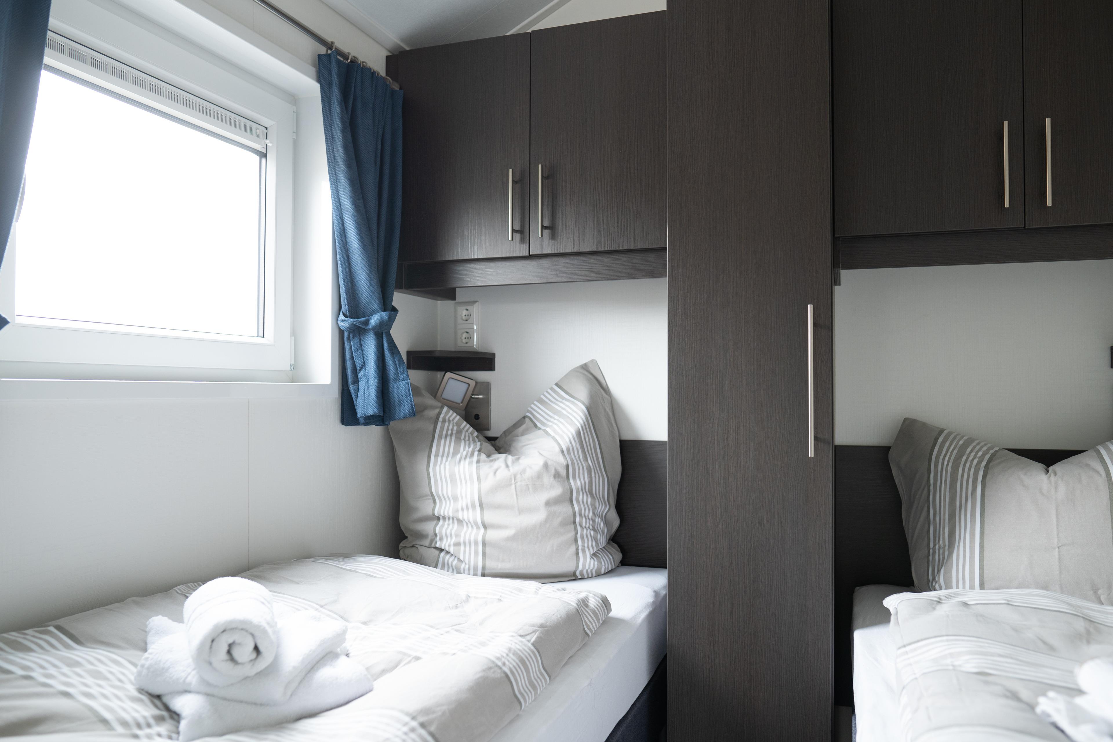 Ferienhaus mit rd. 40m² und Platz für bis zu vier Personen. 2 Schlafzimmer davon 1 mal mit Doppelbett und 1 mal mit zwei Einzelbetten, dazu 1 Badezimmer. Großer Wohnraum mit Küche, Sitzgelegenheiten und Unterhaltungsmedien (TV). Im Außenbereich gibt es einen Parkplatz für Ihr Auto und die Terrasse lädt zum gemütlichen Verweilen ein. Die Chalets befinden sich in einem eigenen Parkareal unseres Platzes mit eigener Zufahrt über den Campingplatz.
