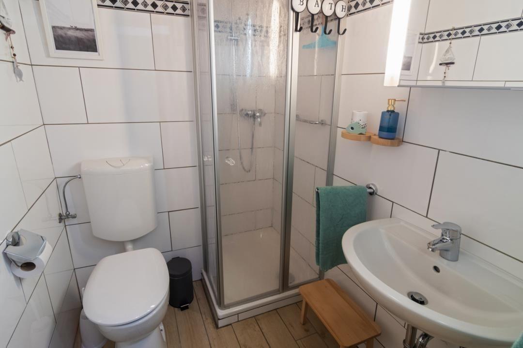 Das Badezimmer ist klein, aber praktisch und ansprechend ausgestattet. Hier finden Sie eine Dusche, ein WC sowie eine Waschkombination mit Spiegel.