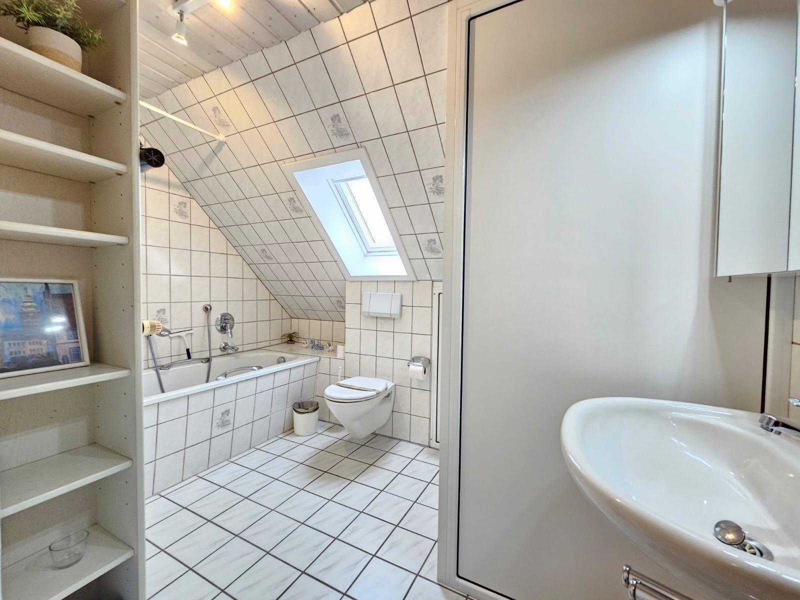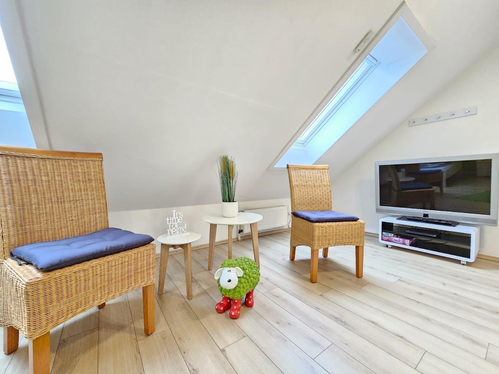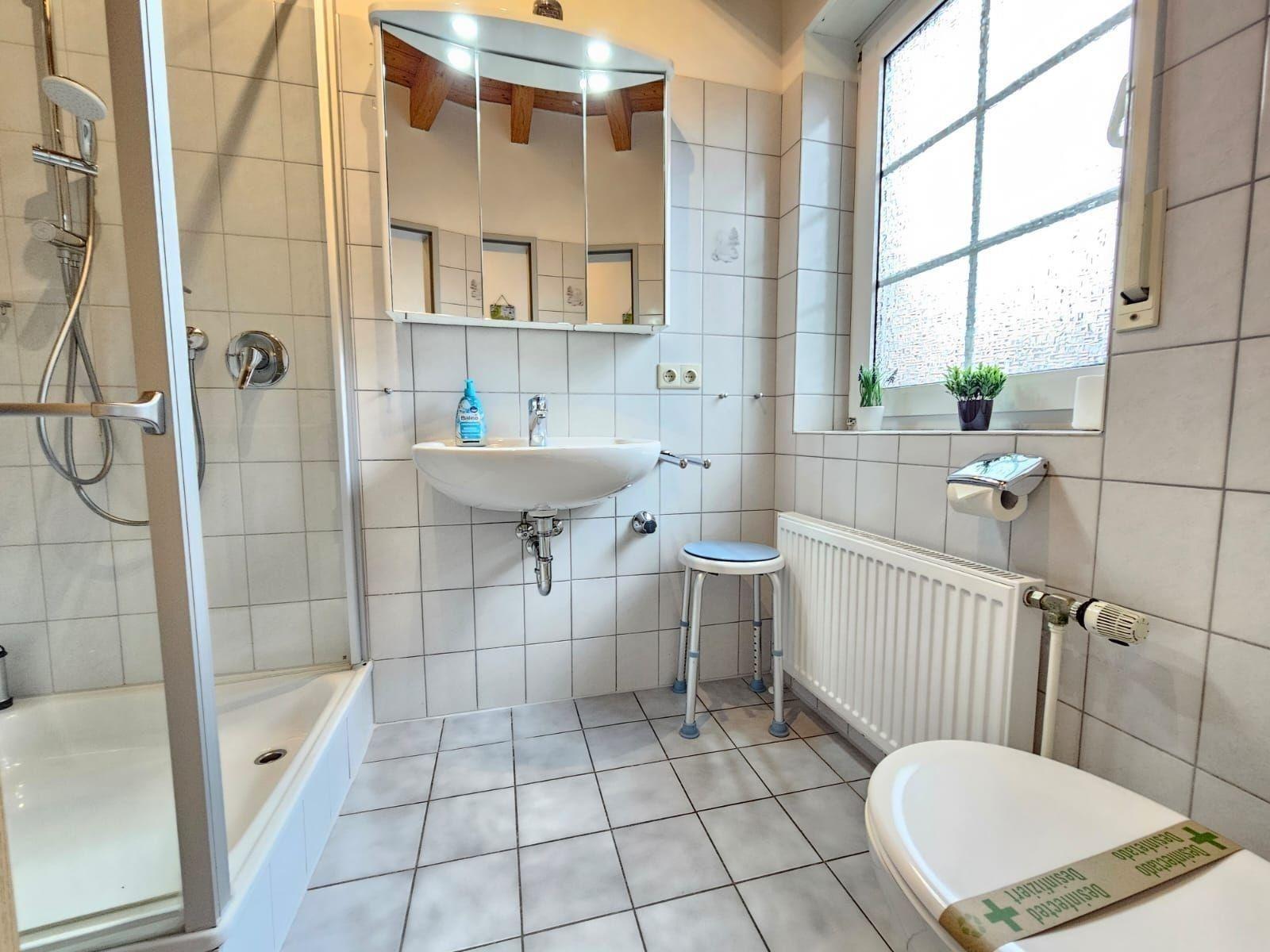 Das Badezimmer mit Fenster bietet eine Badewanne sowie ein Duschbad und ist durch zusätzliche Annehmlichkeiten wie Haartrockner und Kosmetikspiegel perfekt ausgestattet. Zudem sind ein Gäste-WC und eine Waschmaschine vorhanden. Der Wohnbereich mit Sofa, Sessel und Esstisch lädt zum Verweilen ein. WLAN sorgt für Internetverbindung, während Einrichtungen wie Treppenschutz und Allergikergeeignetheit für zusätzlichen Komfort sorgen. Das Starterset mit Pflegeprodukten rundet das Angebot ab und macht den Aufenthalt besonders angenehm.