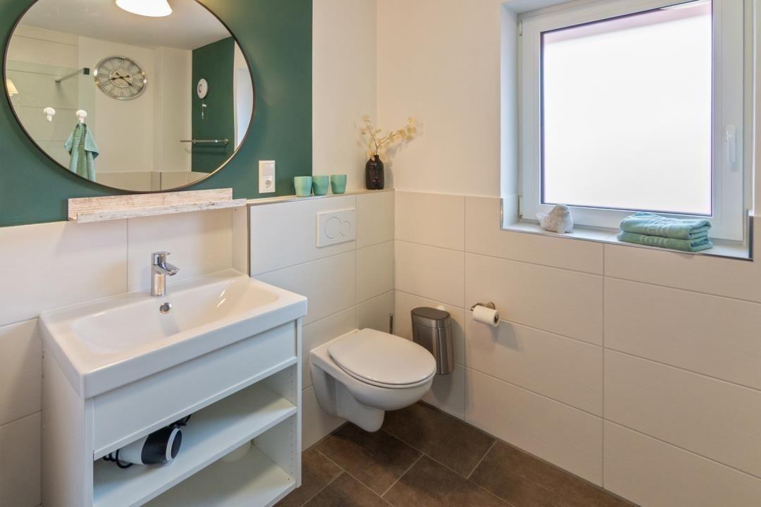 Ein echtes Highlight ist das moderne Badezimmer mit seinen schicken weiß-dunkelbraunen Fliesen. Es ist äußerst großzügig und mit dem großen Fenster auch angenehm hell. Die ebenerdige Dusche bietet Ihnen viel Platz. Außerdem stehen Ihnen im Badezimmer eine Waschmaschine und ein praktischer Trockner zur Verfügung. Einen Haartrockner finden Sie im Badezimmerschränkchen unter dem Spiegel.