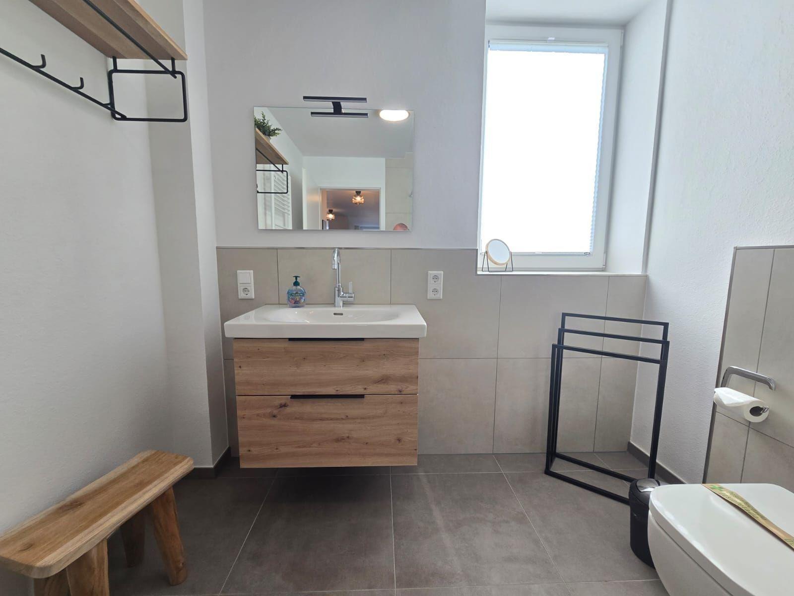 Das moderne Duschbad mit Fenster verfügt über einen Haartrockner und ein Starterset mit Toilettenartikeln. Der Wohnbereich mit Sofa, Sessel und Esstisch bietet ausreichend Platz zum Entspannen. Zur Ausstattung gehört zudem ein TV, WLAN-Internetzugang sowie ein Parkplatz und ein Fahrstuhl für zusätzlichen Komfort. Reinigungsmittel, Geschirrtücher und eine Garderobe sind ebenfalls vorhanden. Diese gut ausgestattete Ferienwohnung erfüllt alle Ansprüche für einen gelungenen Aufenthalt.