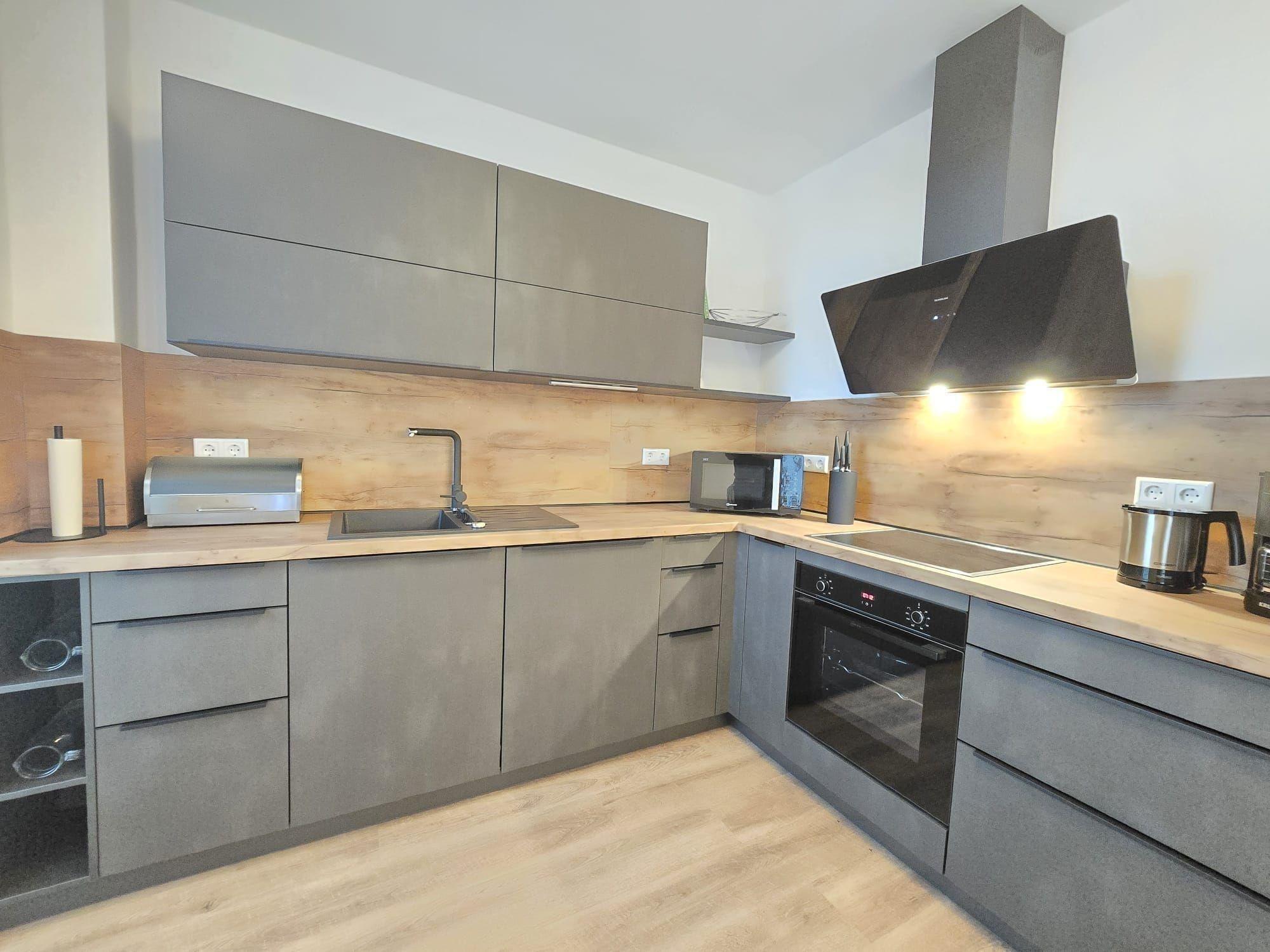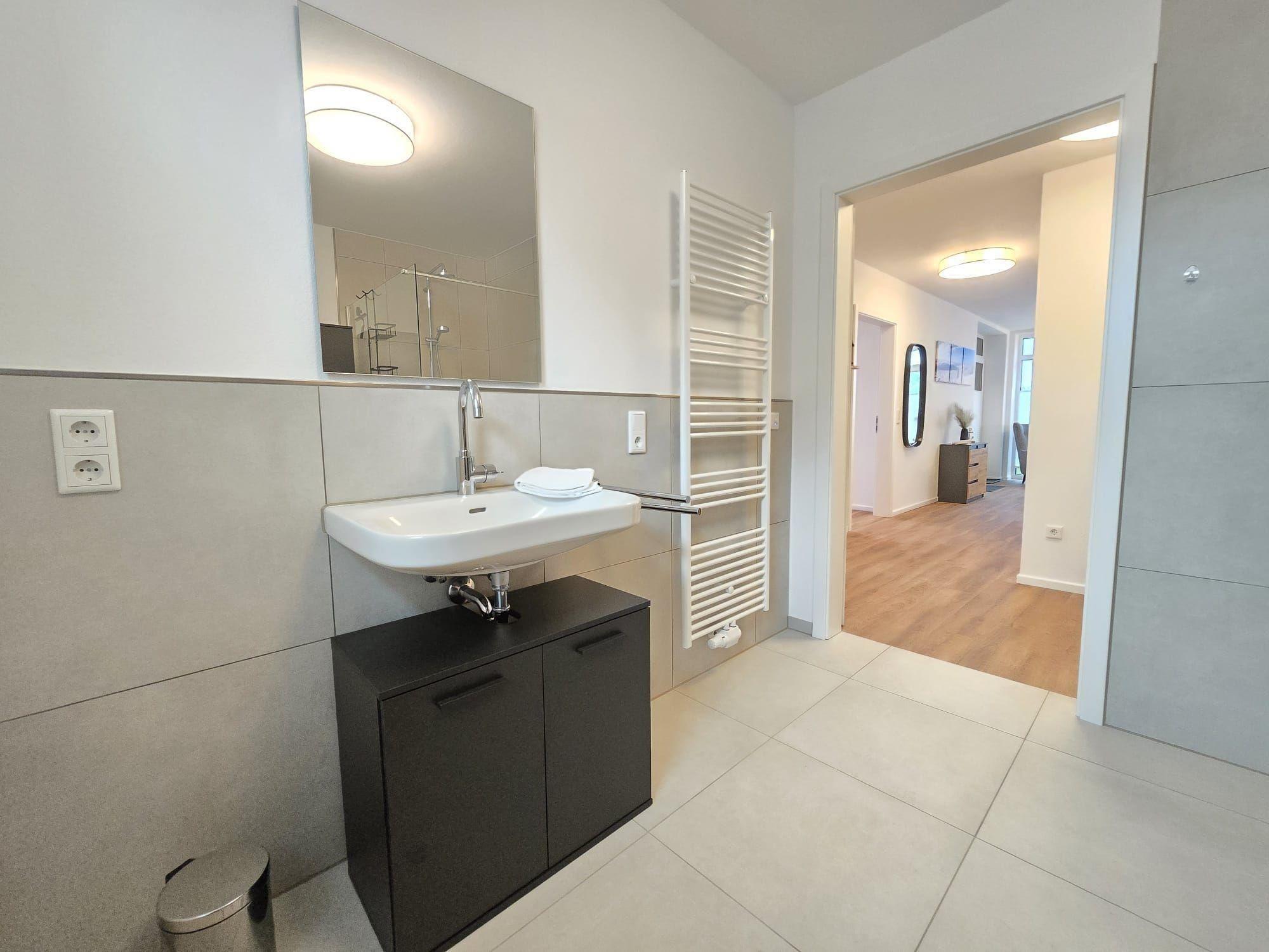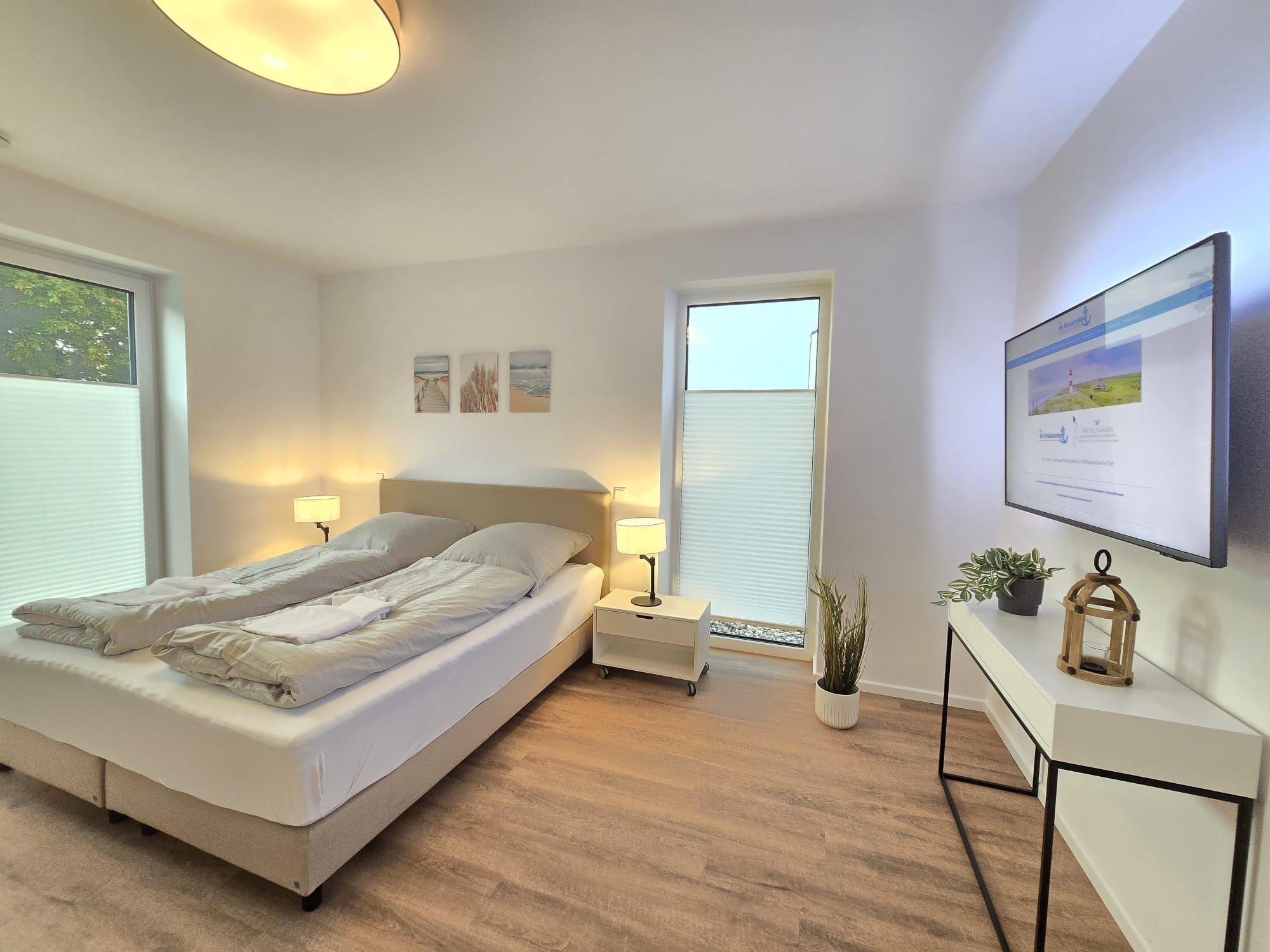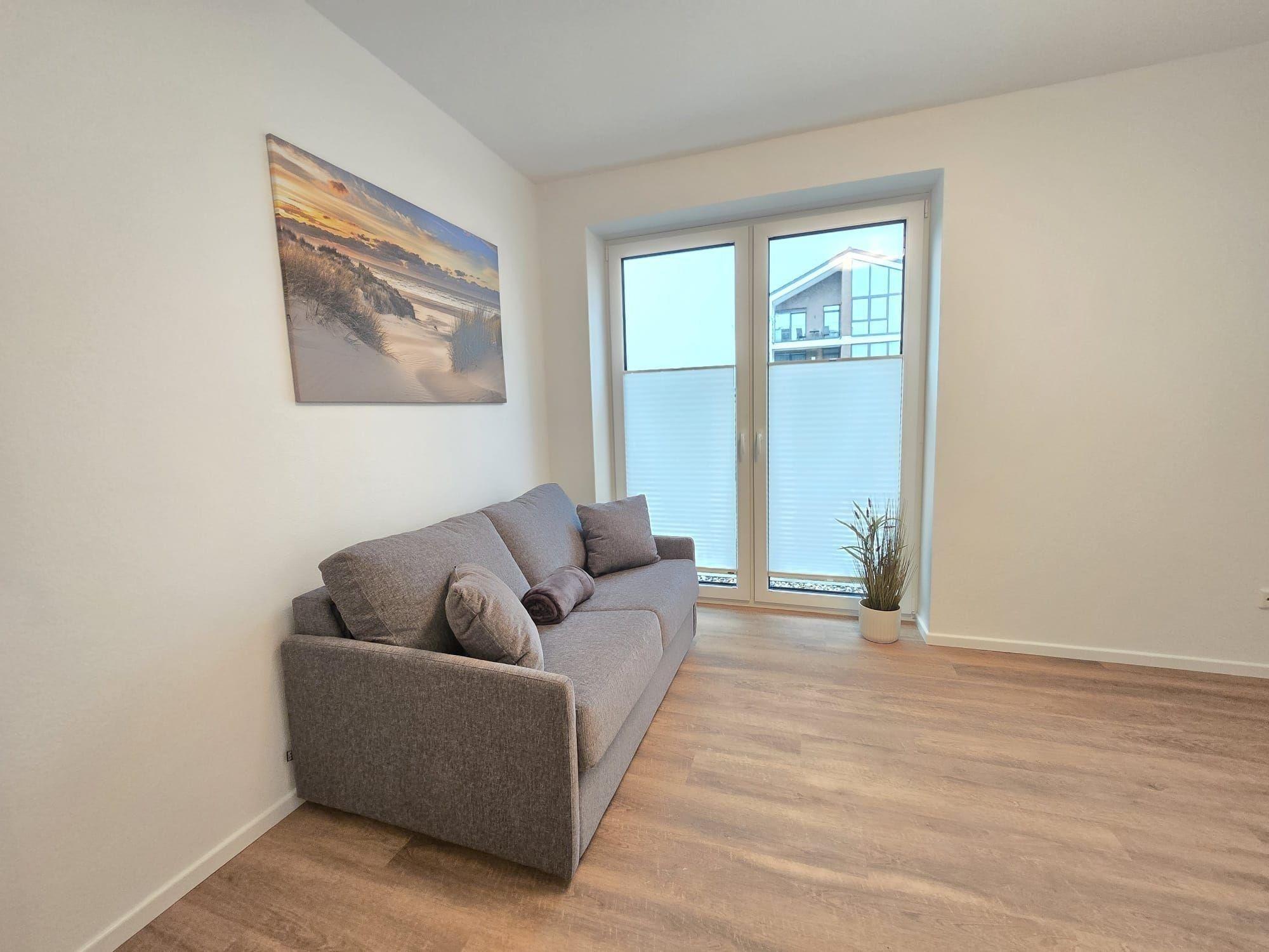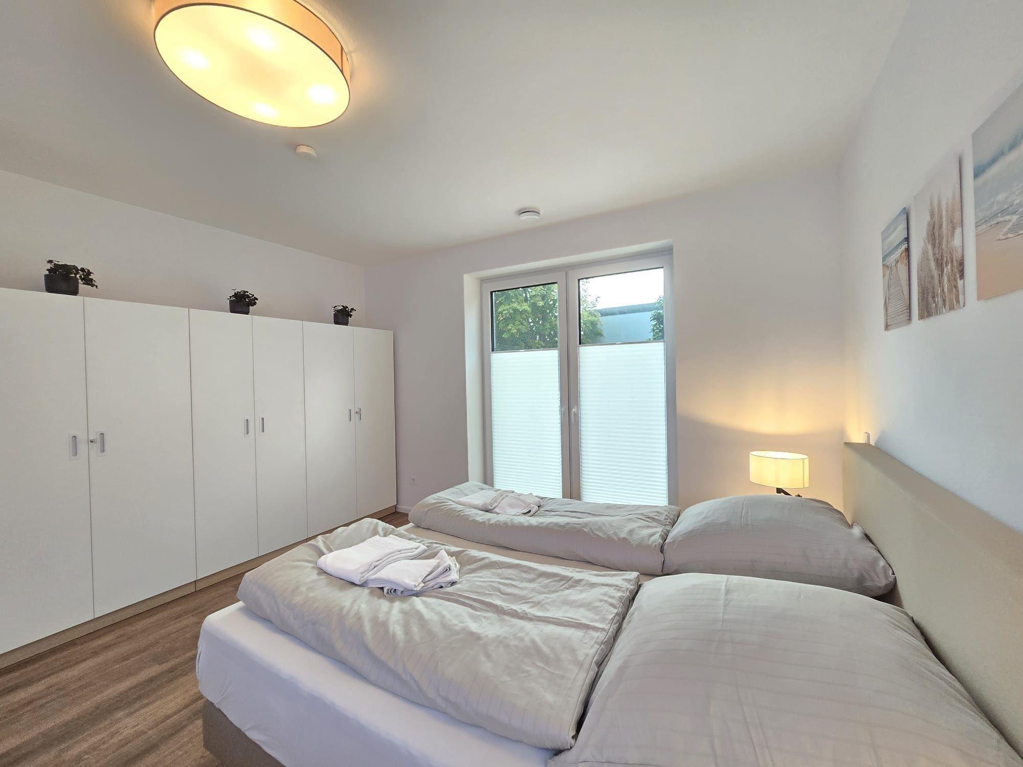 Die Ferienwohnung begeistert durch ihre großzügige und durchdachte Raumaufteilung. Sie bietet zwei komfortable Schlafzimmer, darunter ein Doppelbett und eine Schlafcouch, sowie ein modernes Badezimmer mit Fenster und Duschbad. Die offene Küche ist bestens ausgestattet mit einem Elektro-/Gasherd, Backofen, Geschirrspüler, Kühlschrank, Mikrowelle und Kaffeemaschine. Geschmackvolle Details wie ein Esstisch und ein gemütliches Sofa im Wohnschlafzimmer laden zum Verweilen ein. Die barrierefreie und seniorengerechte Ausstattung umfasst Wäschetrockner, Waschmaschine, Fahrstuhl sowie zahlreiche Annehmlichkeiten für Allergiker. WLAN ist ebenfalls verfügbar. Ein Parkplatz gehört zur Wohnung, ebenso wie ein Starterset mit Seifen und Reinigungsmitteln. Die Kombination aus Funktionalität und Komfort sorgt für erholsame Tage. Die Wohnräume sind hell und freundlich gestaltet, um eine angenehme Atmosphäre zu schaffen.