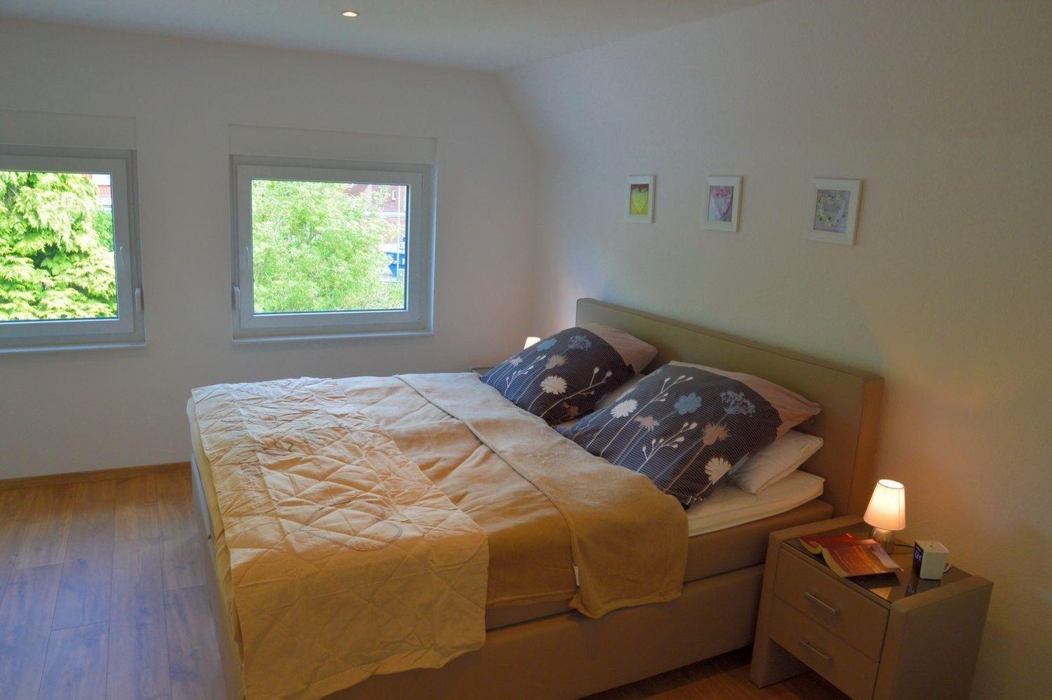 Zwei weitere Schlafzimmer eins mit komfortablem Boxspringbett und ein Einzelzimmer sowie ein zweites Badezimmer mit bodentiefer Dusche, Waschbecken, WC, Fön und Handtuch- und Fußbodenheizung stehen Ihnen im Obergeschoss zur Verfügung.