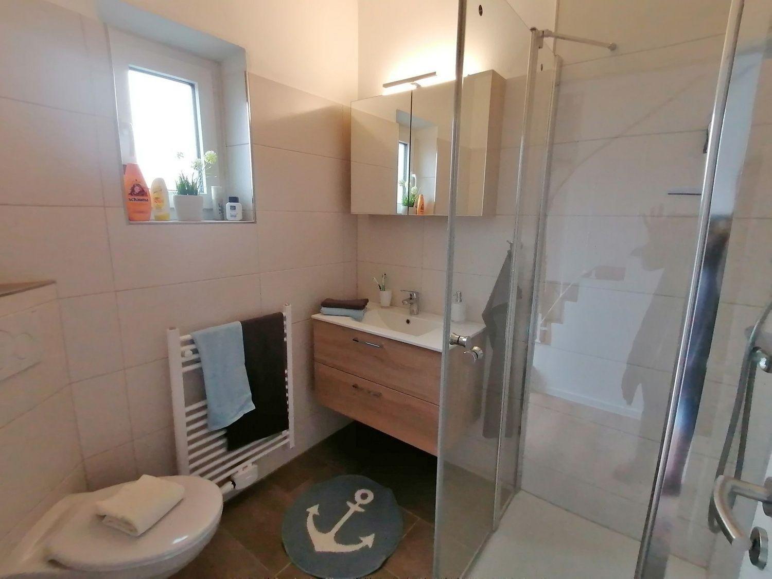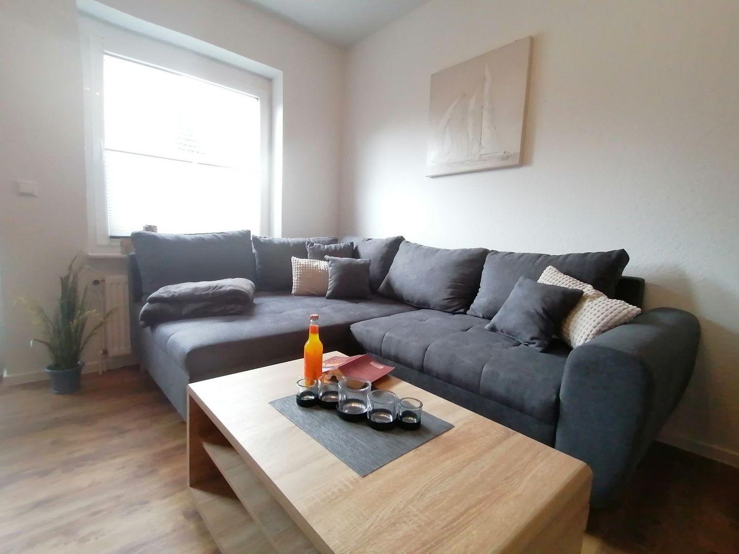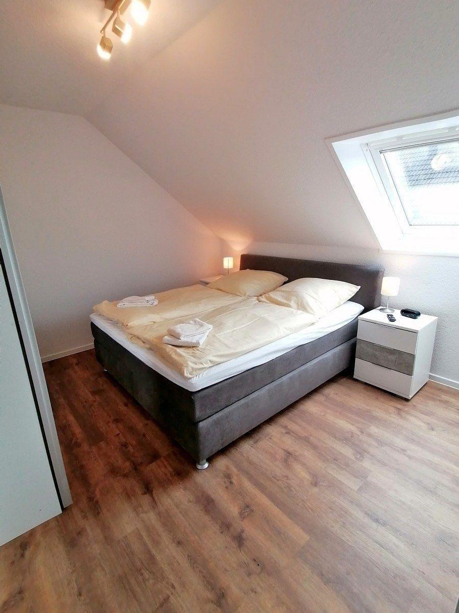 Das Wohnzimmer verfügt über ein Ecksofa mit Couchtisch und einem Smart TV. Am Esstisch mit vier Schwingstühlen können Sie gemütlich speisen. Die angrenzende Küche hat eine neue Einbauküche mit einem Ceranfeld, einem Geschirrspüler, einem Backofen, Kühlschrank, einer Kaffeemaschine, einem Toaster, ein Wasser- und Eierkocher, Geschirr und Besteck. Zusätzlich bietet Ihnen die Wohnungen vier Schlafmöglichkeiten an. Diese sind aufgeteilt in zwei Schlafzimmern. Dazu gibt es ein Badezimmer mit einer bodentiefen Dusche im EG und ein Gäste-WC im OG.