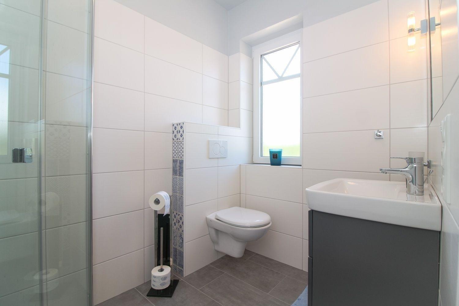 Das Tageslichtbad bietet Ihnen eine bodentiefe Dusche, WC, Waschbecken und Handtucherwärmung.