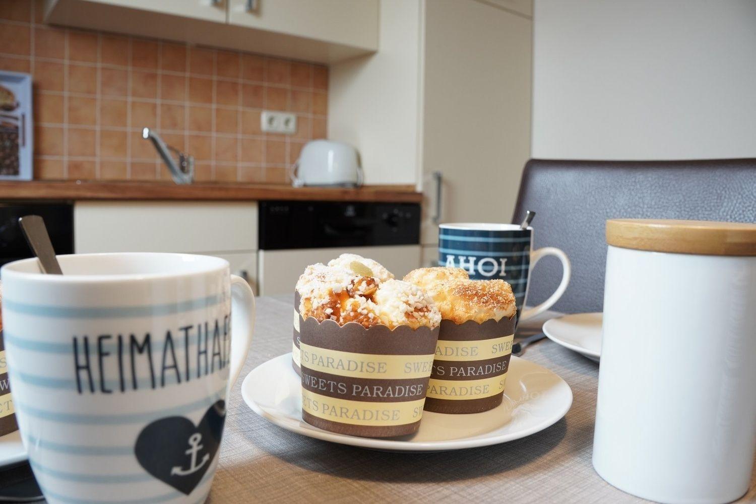 Zur Einbauküche gehören ein Kühlschrank mit kleinem Eisfach, Geschirrspüler, Ceranfeld, Backofen, Mikrowelle, Kaffeemaschine, Toaster, Wasserkocher sowie Essgeschirr.