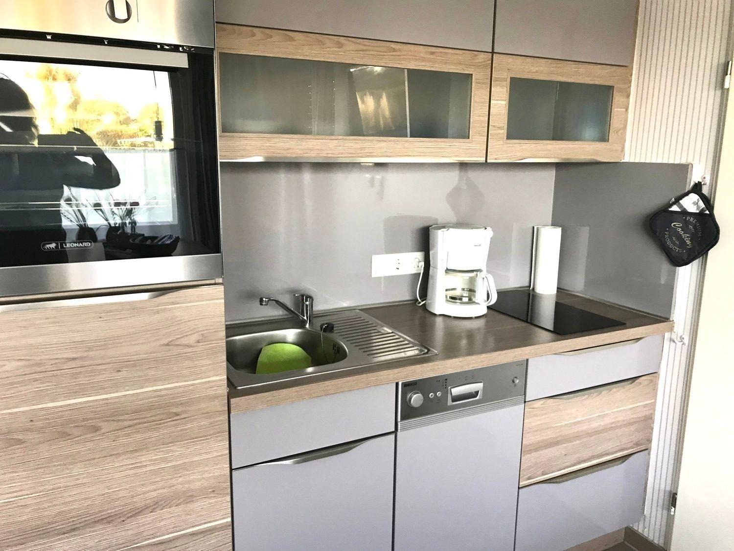 In der Küche befindet sich eine hochwertige Küchenzeile mit Geschirrspüler, Backofen, Ceranfeld, Kaffeemaschine, Senseo, Toaster, Eierkocher, Wasserkocher, Geschirr und Kochutensilien sind ebenfalls neu und ausreichend vorhanden.