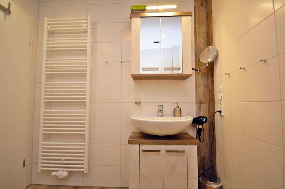 Das harmonisch gestaltete Badezimmer hat eine 1m x 1m große, ebenerdige Dusche. Handtuchtrockner, Waschtisch mit Spiegel- und Unterschrank,Kosmetikspiegel und Föhn sind ebenfalls vorhanden.